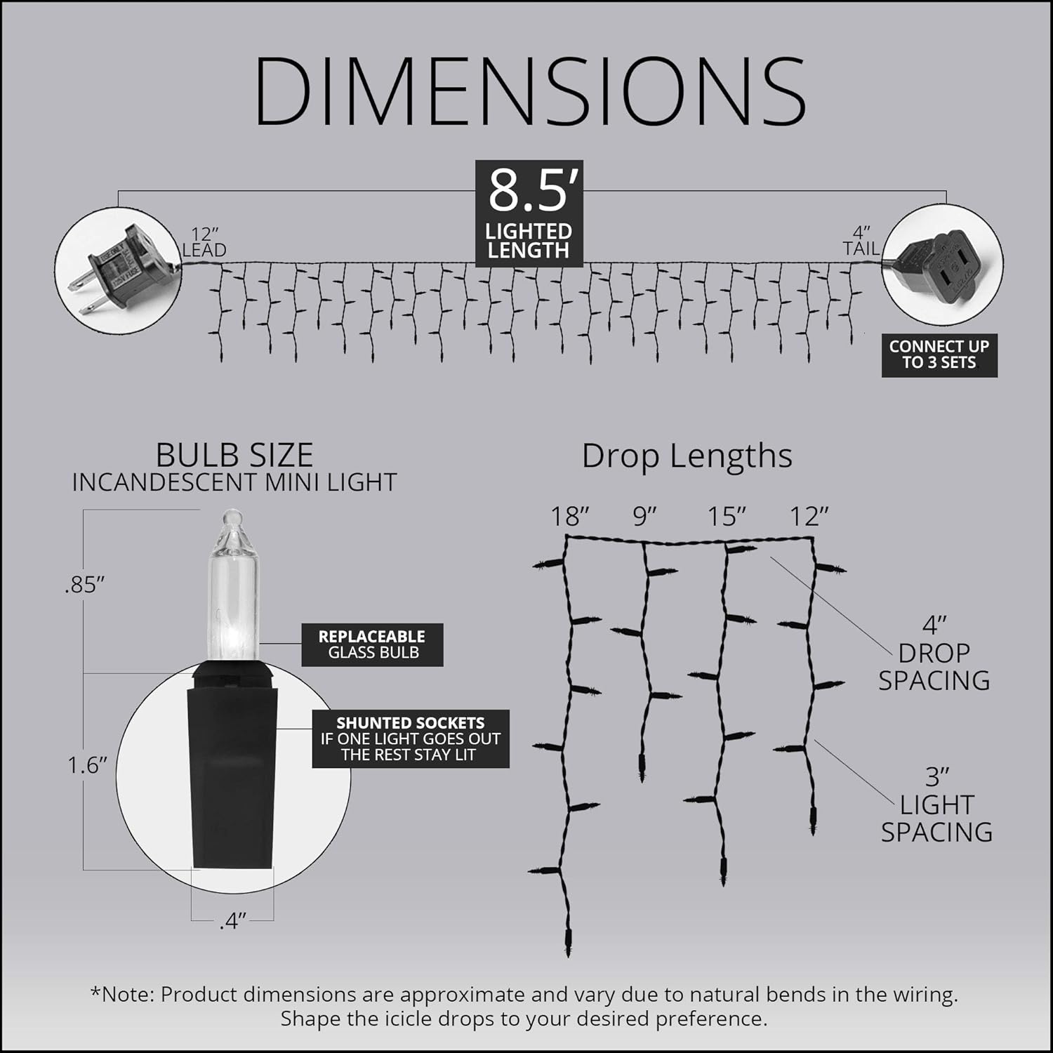 - ** INCANDESCENT ICICLE LIGHTS ** 150 traditional clear incandescent icicle lights on white wire, 27 vertical drops in lengths of 18", 9", 15", and 12"; approximately 8.5 ft. lighted length, 12β lead, 4β tail.