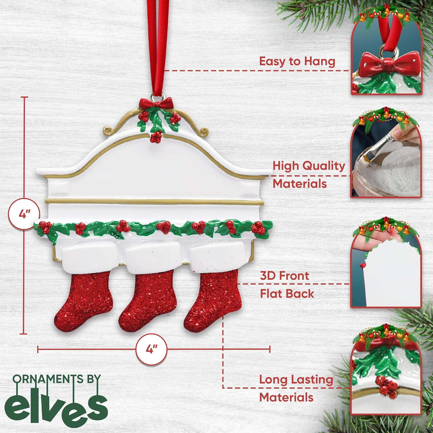 - đ Celebrate Your Family of 3: Mark a joyful milestone with a personalized family of 3 Christmas ornament 2025. Whether itâs your first year or a growing tradition, this keepsake honors your bond and tells your story with warmth, love, and a touch of festive magic. This white and gold fireplace ornament features glitter red Christmas stockings, a red bow holiday decoration, and a festive holly garland with berries, all set against a blank mantle for personalization.