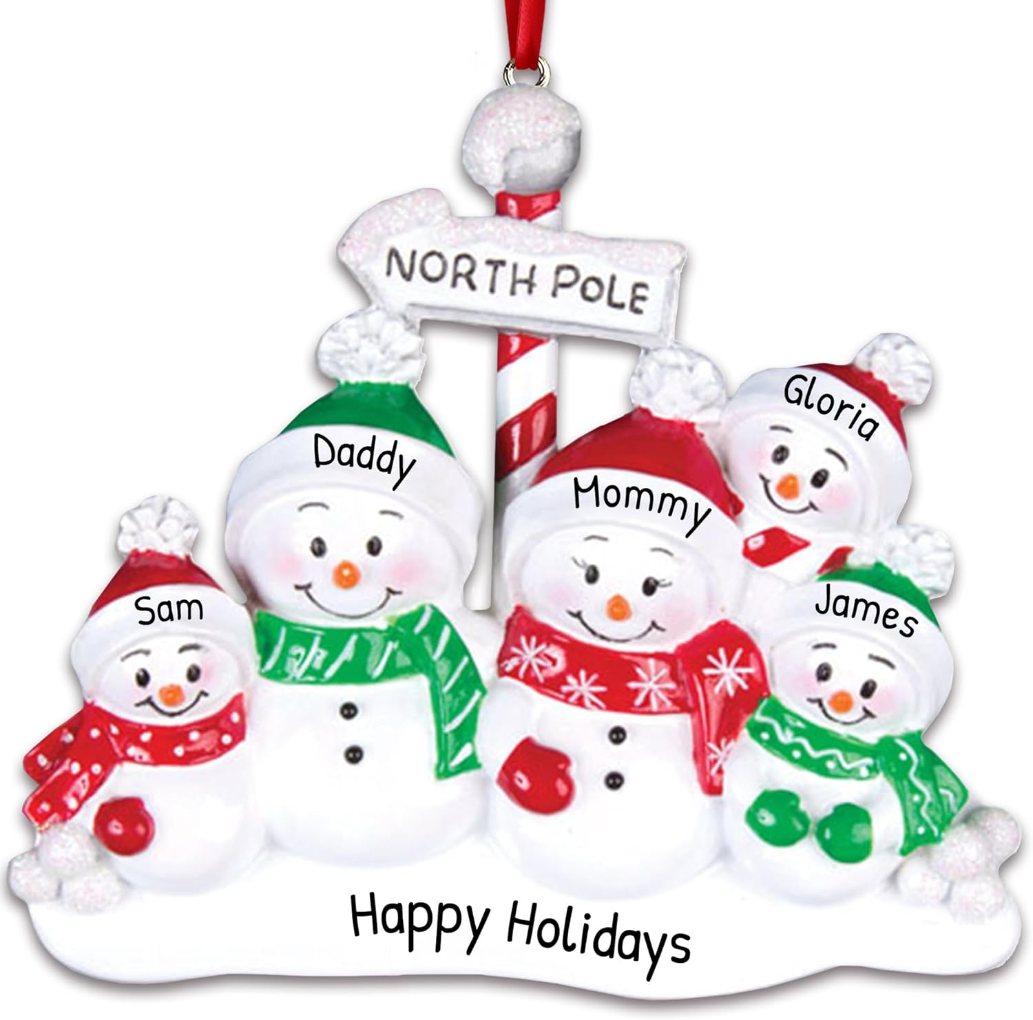 - đ Celebrate Your Family of 5: Mark a joyful milestone with a personalized family of 5 Christmas ornament 2025. Whether itâs your first year as five or part of a cherished tradition, this keepsake honors your growing bond and tells your story with warmth, love, and festive cheer. This snowman family of five ornament features smiling snow faces and carrot noses, red and green winter accessories, and a North Pole sign with glitter top, bringing a cozy snow scene holiday theme to life.