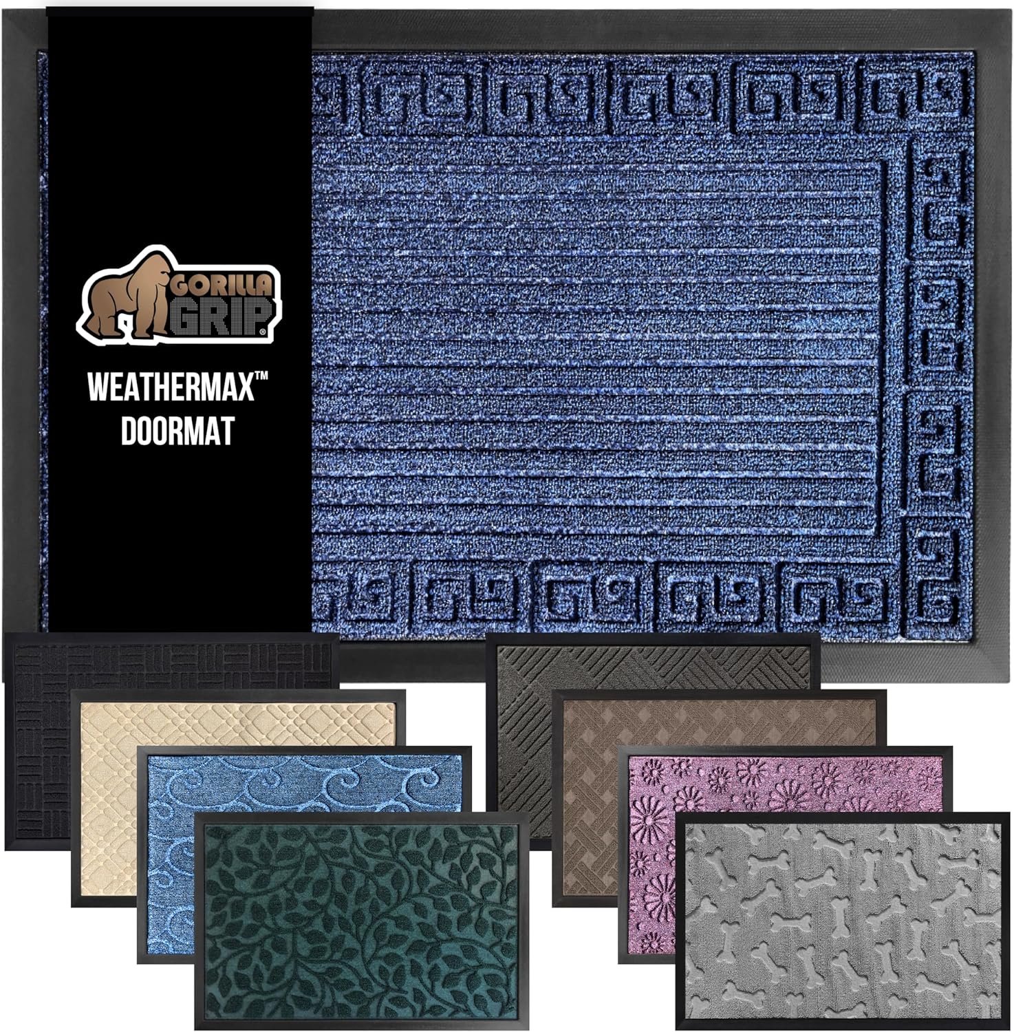 GORILLA GRIP 100% Waterproof All-Season WeatherMax Doormat, US Designed Natural Rubber, Stain and Fade Resistant, Low Profile Indoor Outdoor Door Mats, Easy Clean Patio Mat, 17x29, Navy Greek Keys