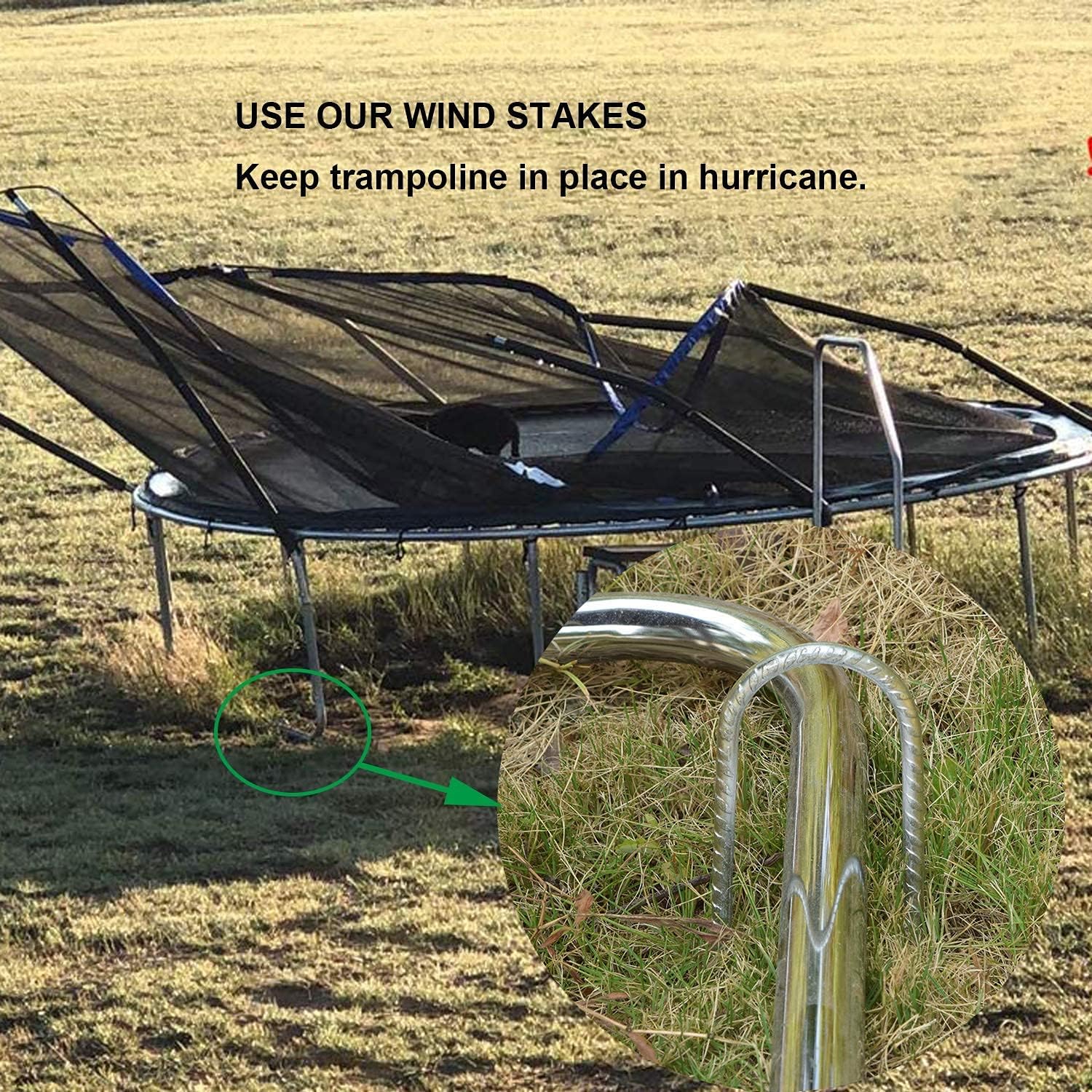 - KEEP TRAMPOLINE IN PLACE - If you have a trampoline, it is necessary to add these heavy duty wind stakes to reinforce and keep it in place when the trampoline is used, especially in the place always meet hurricane or other strong winds. These ground anchors will keep your trampoline from flipping or moving during use, and kids will not fall off or hit to ground.