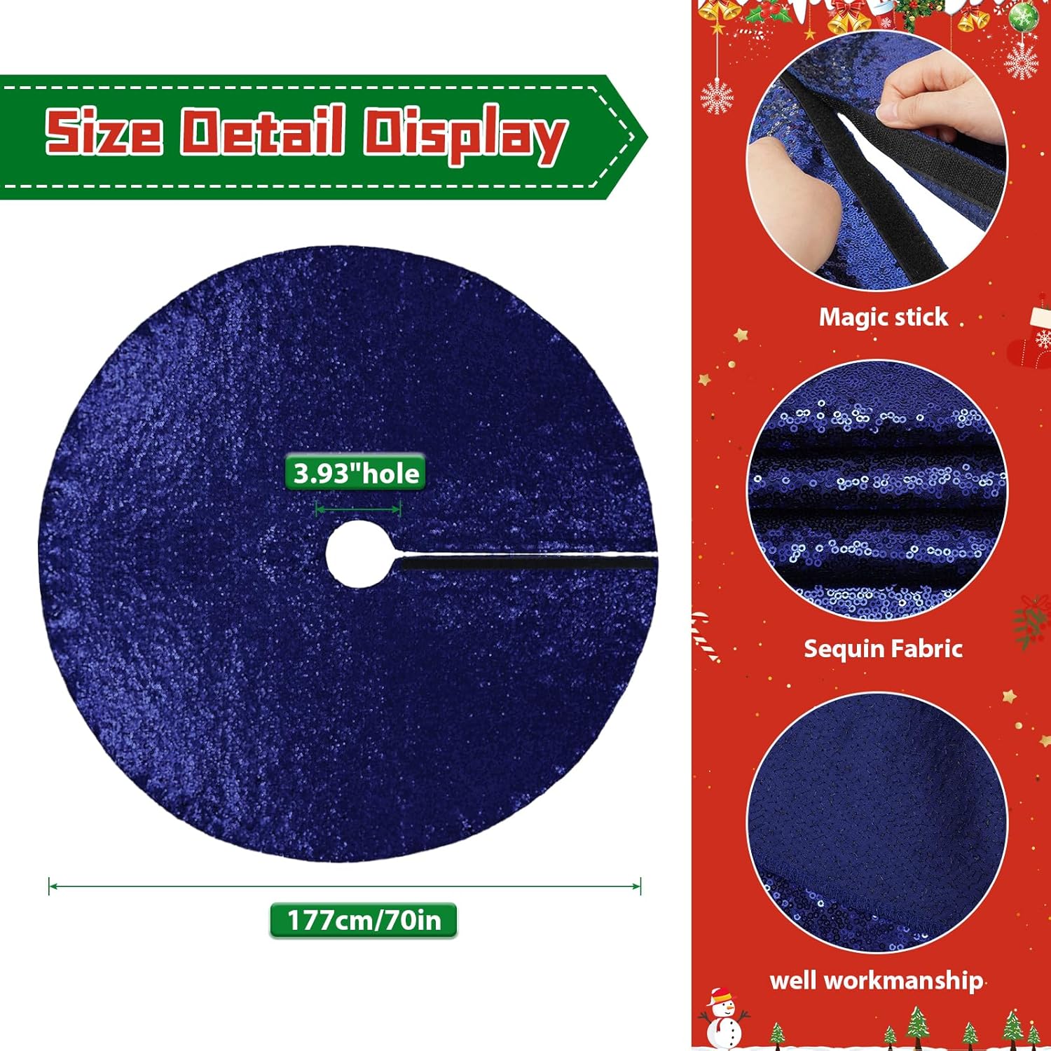 - 【Sequin Material-Not See Through】: The sequin tree skirts are thick and dense 3MM round high-density material sequins with satin fabric backing.Tree Skirt Serged edges with hook and loop fasteners avoid falling sequins