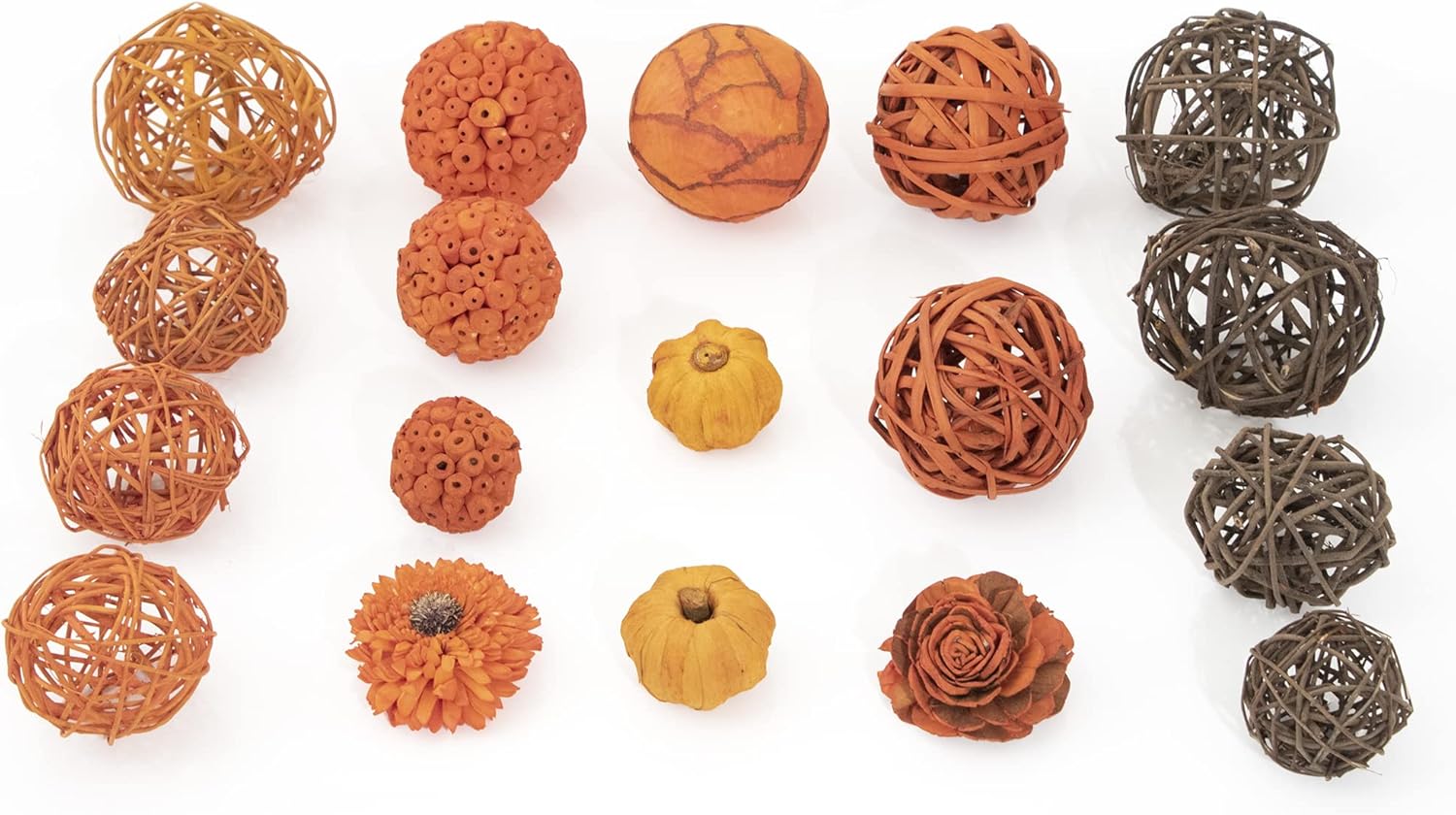 - Includes Mini Pumpkins, Flower and Unique Decorative Orbs