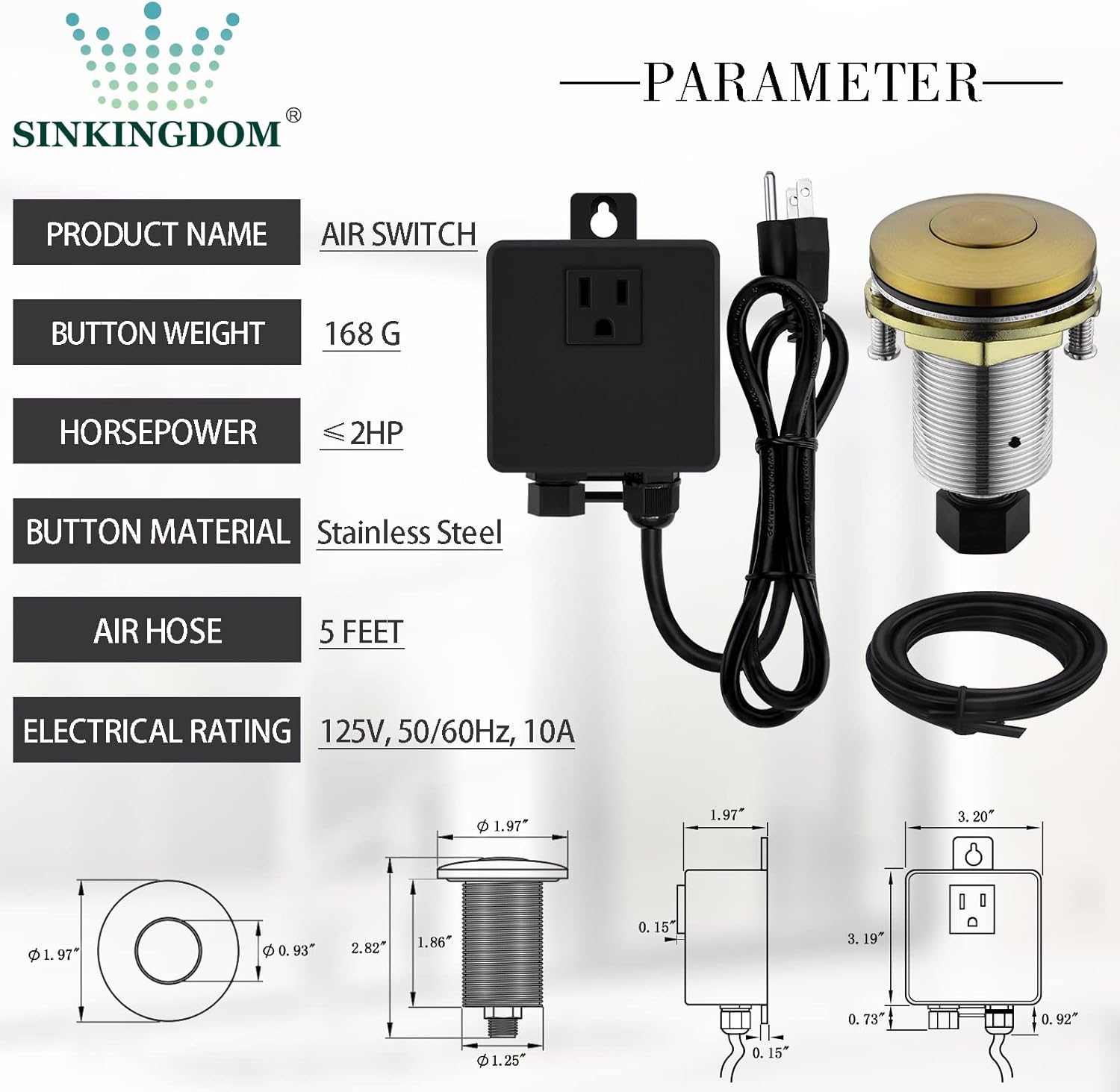 - Digital: 3.20"x 3.19"x 1.97" Power Adapter, 60.00"/1.5M Air Tube and 40.00" Power Cable, 2.95"x 1.25" Air Switch Adapter Button, 1-3/8"Countertop Hole, 2HP, UL Certification.