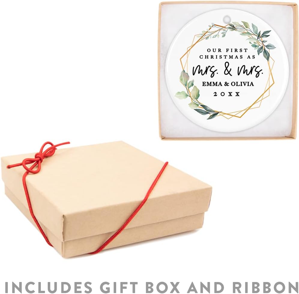 Andaz Press Personalized Our First Christmas As Mrs. & Mrs. 2025 Christmas Ornaments Geometric Greenery 2.8" Round Porcelain Ceramic Lesbian Married Couple Gay Women Newlyweds Wedding Keepsake 1-Pack