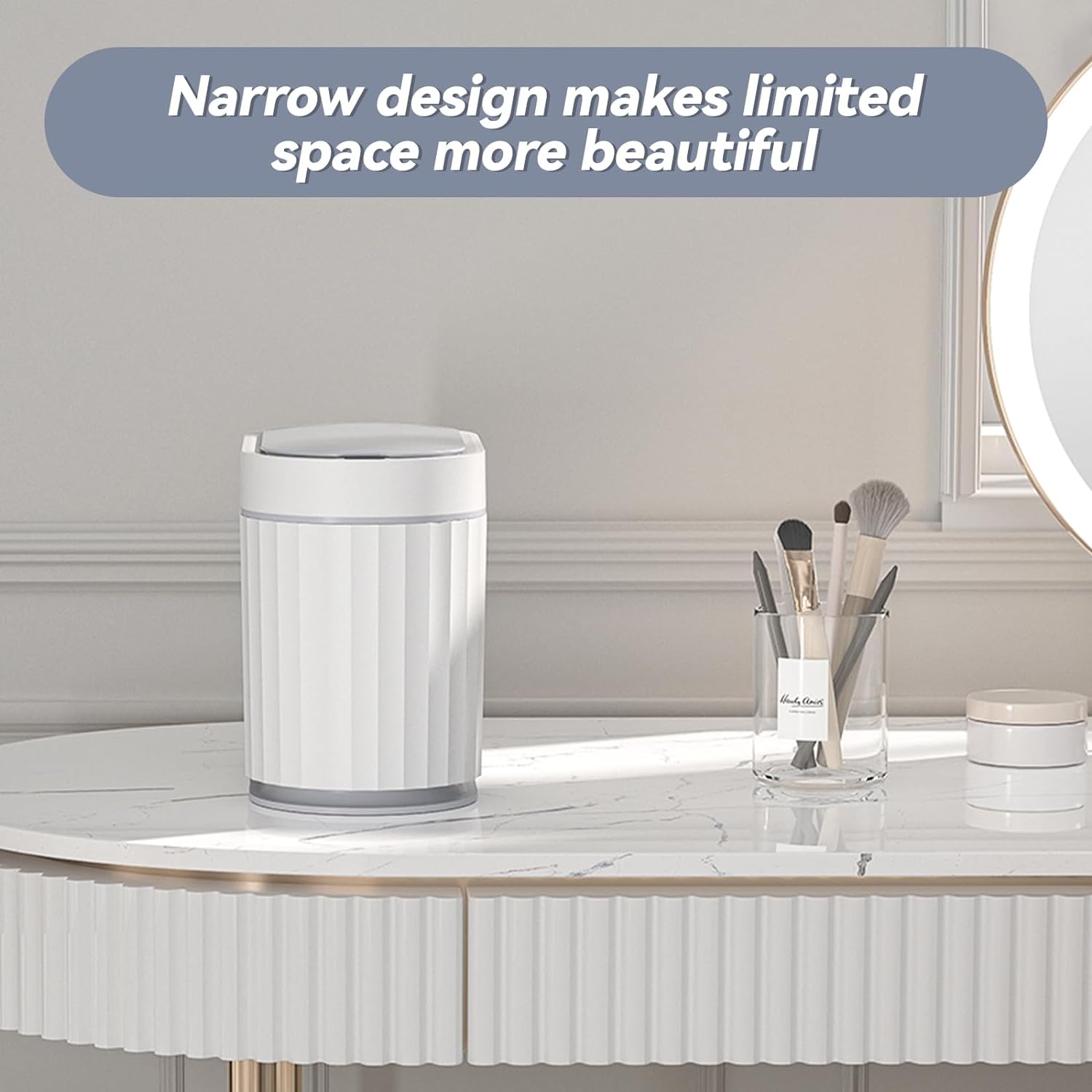 ELPHECO Mini Trash Can with Lid Small Desktop Trash Can with Lid, 5 Liter Automatic Garbage Bin, 1.3 Gallon Motion Sensor Countertop Waste Basket for Bedroom, Office, Bathroom, White with Grey Trim