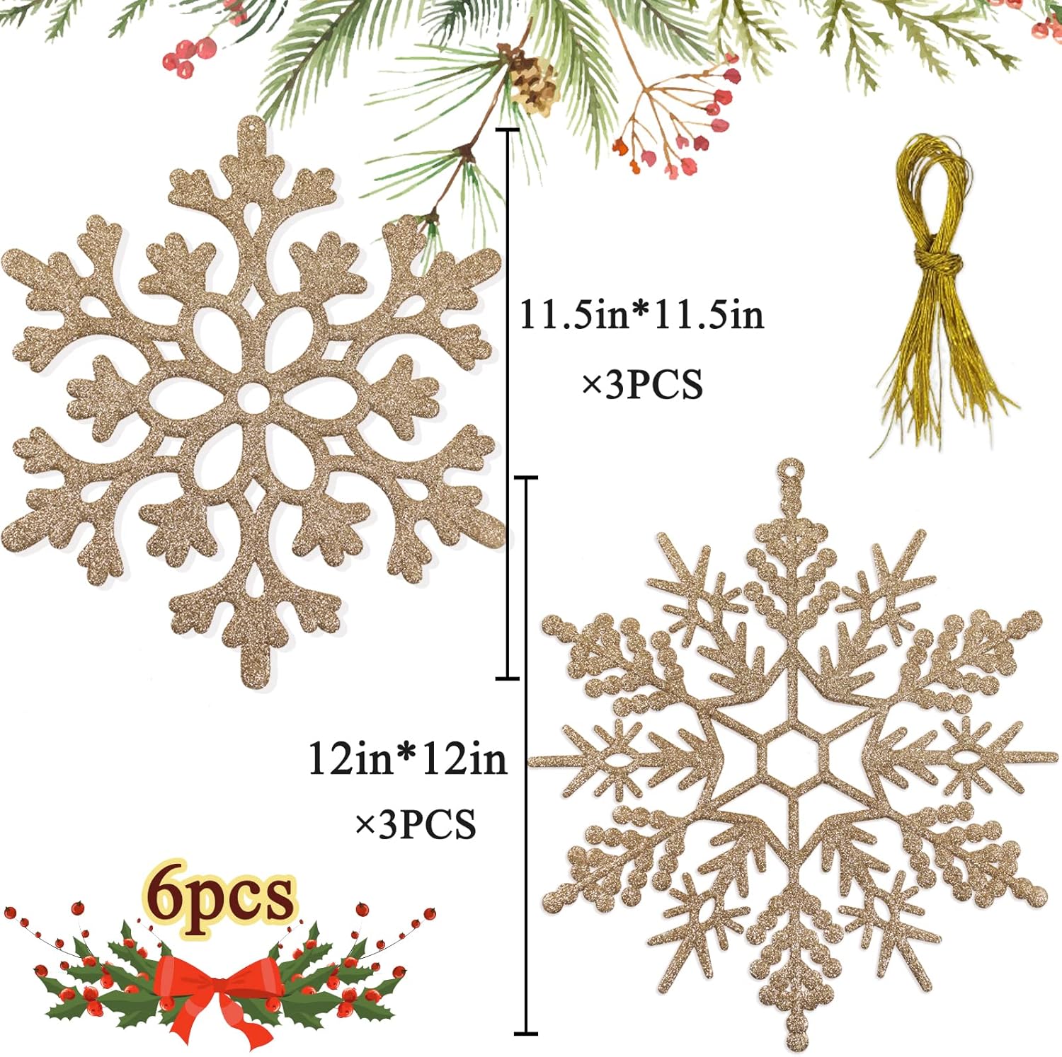 6pcs Large Champagne Gold Snowflakes Ornaments 12” Big Plastic Glitter Snowflake for Winter Indoor Outdoor Christmas Tree Window Room Decorations Giant Craft Snowflakes