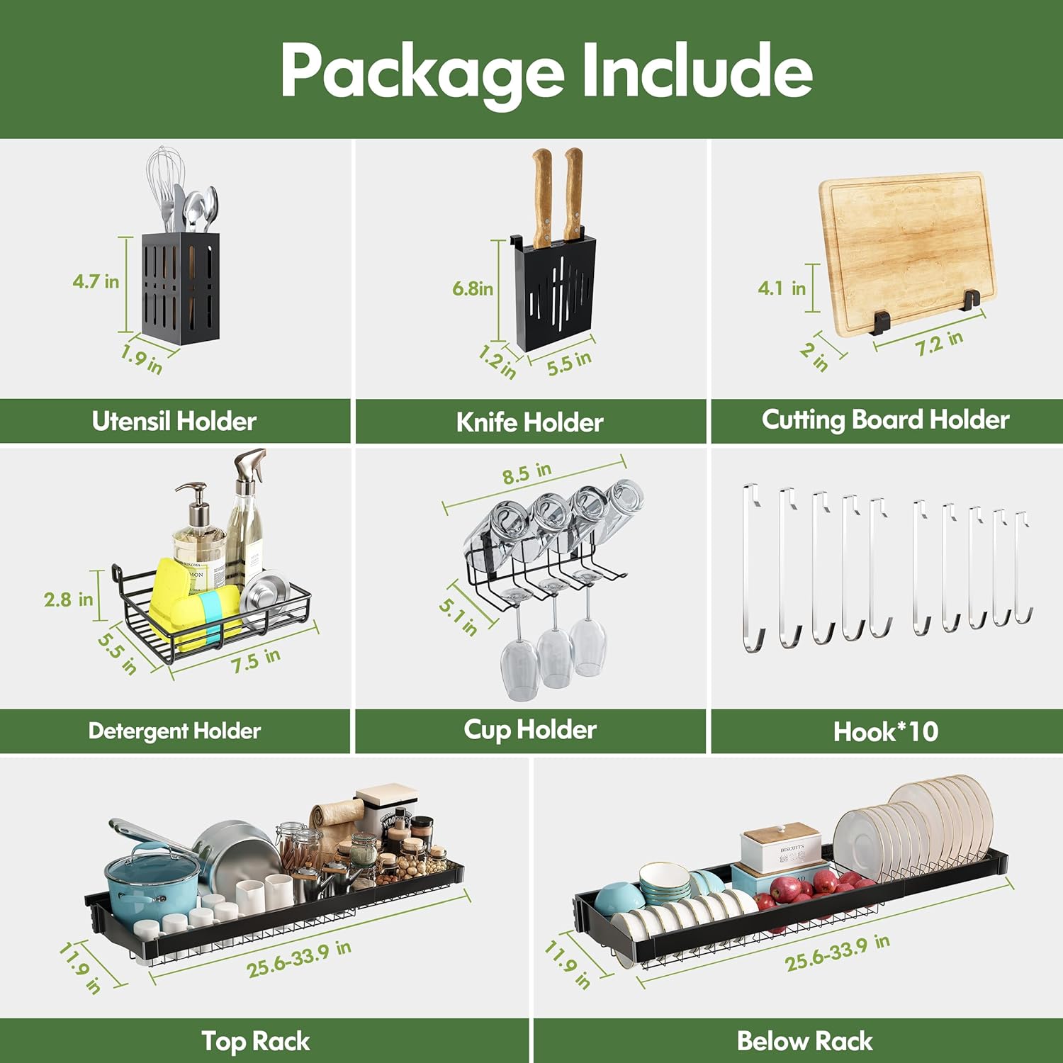 - đź§ş Multi Level Storage Efficiency: Three spacious tiers organize dishes by type, large cookwares on top, bowls and plates in the middle, while dedicated sponge holder and hanging hooks keep sponges and brushes accessible. The dish rack over sink open grid design accelerates drying by promoting airflow, reducing water spots