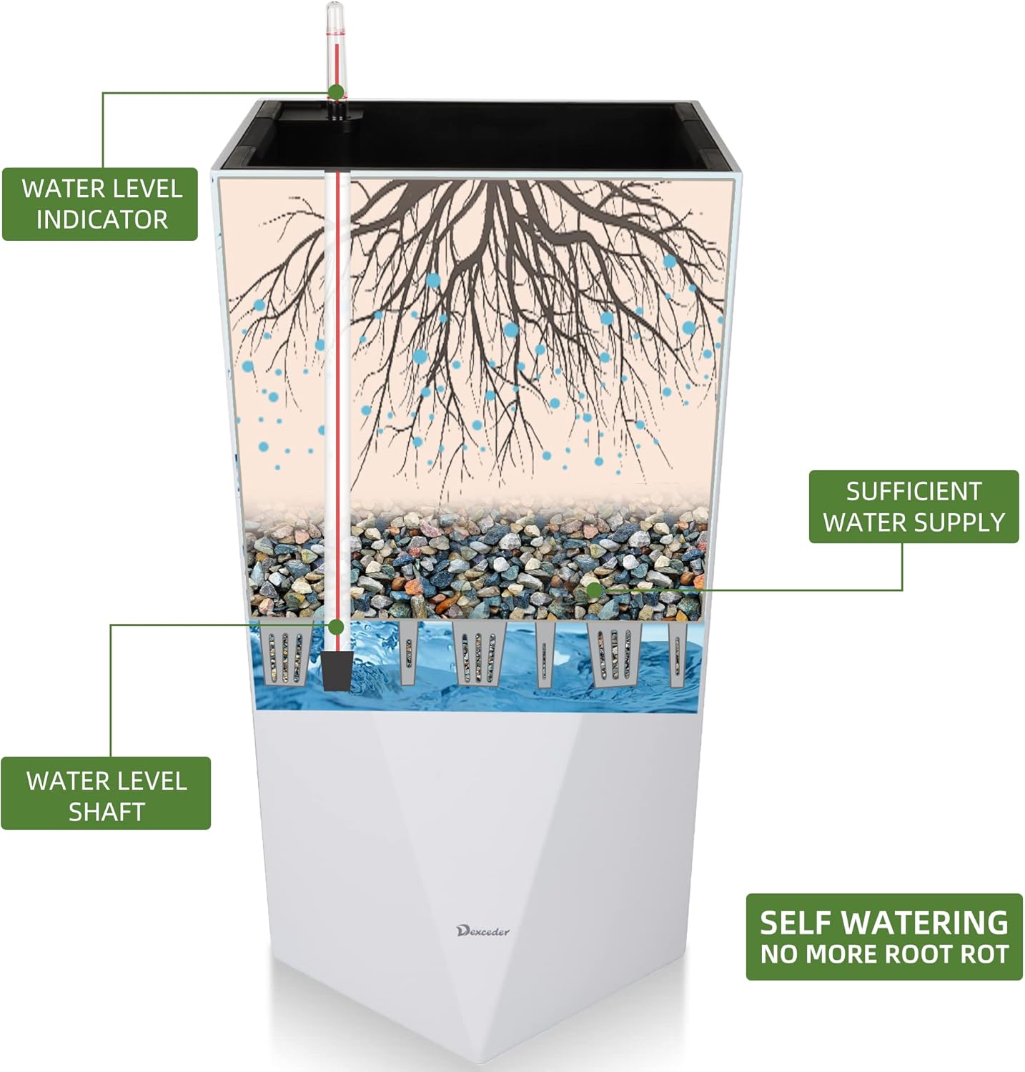 - SELF WATERING & NO MORE ROOT ROT - The smart unique sub-irrigation system is one of the most appealing aspects among all Dexceder planters. The easy-to-use separated integrated water reservoir or catcher- keeps your soil well aerated and automatic supplies plants with the right amount of ongoing moist air & nutrition for optimal growth. The insert indicator shows you the exact time to water again. The full water supply period can single-handedly last over 1 month based on different live plants