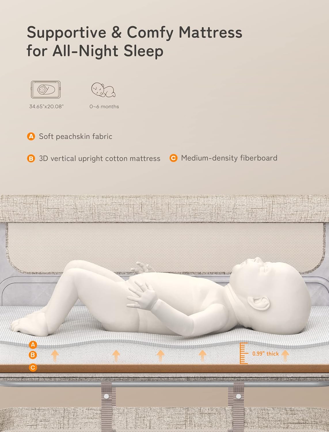 - Spine Protective Mattress: A spacious shape memory mattress (34.65" x 20.08") made of skin-friendly 3D vertical cotton is designed for infants from 5 months up to 19.8 lbs. It's 2.5 cm thick, as recommended by experts, to provide all-around support and protection for your baby's spine