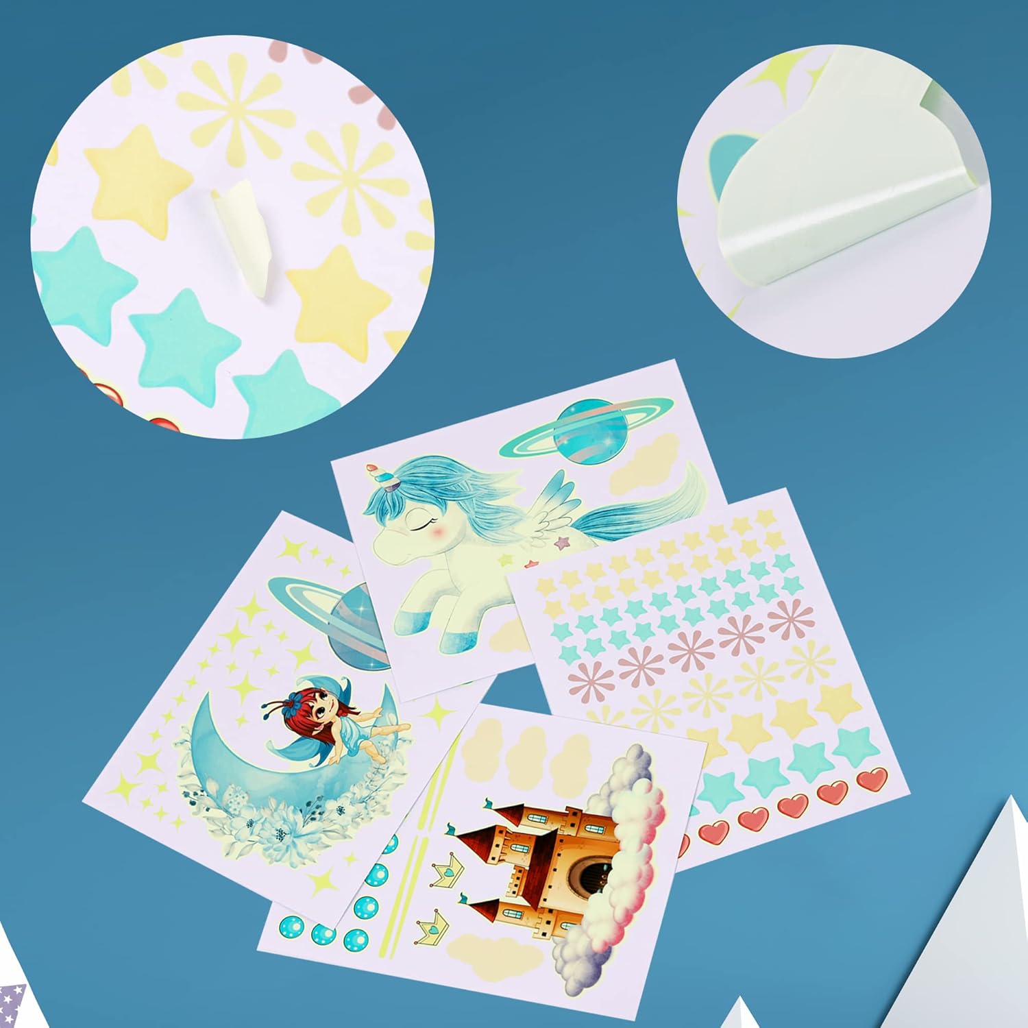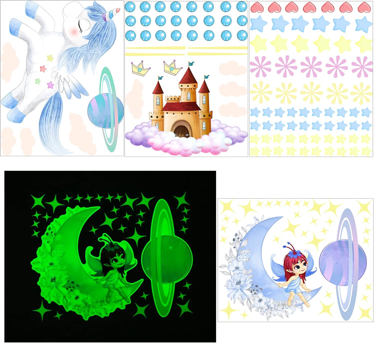 Glow in The Dark Fairy Unicorn Wall Decal Sticker, Girl Bedroom Star Rainbow Castle Princess Wallpaper Decoration, Glowing Moon Ceiling Decor