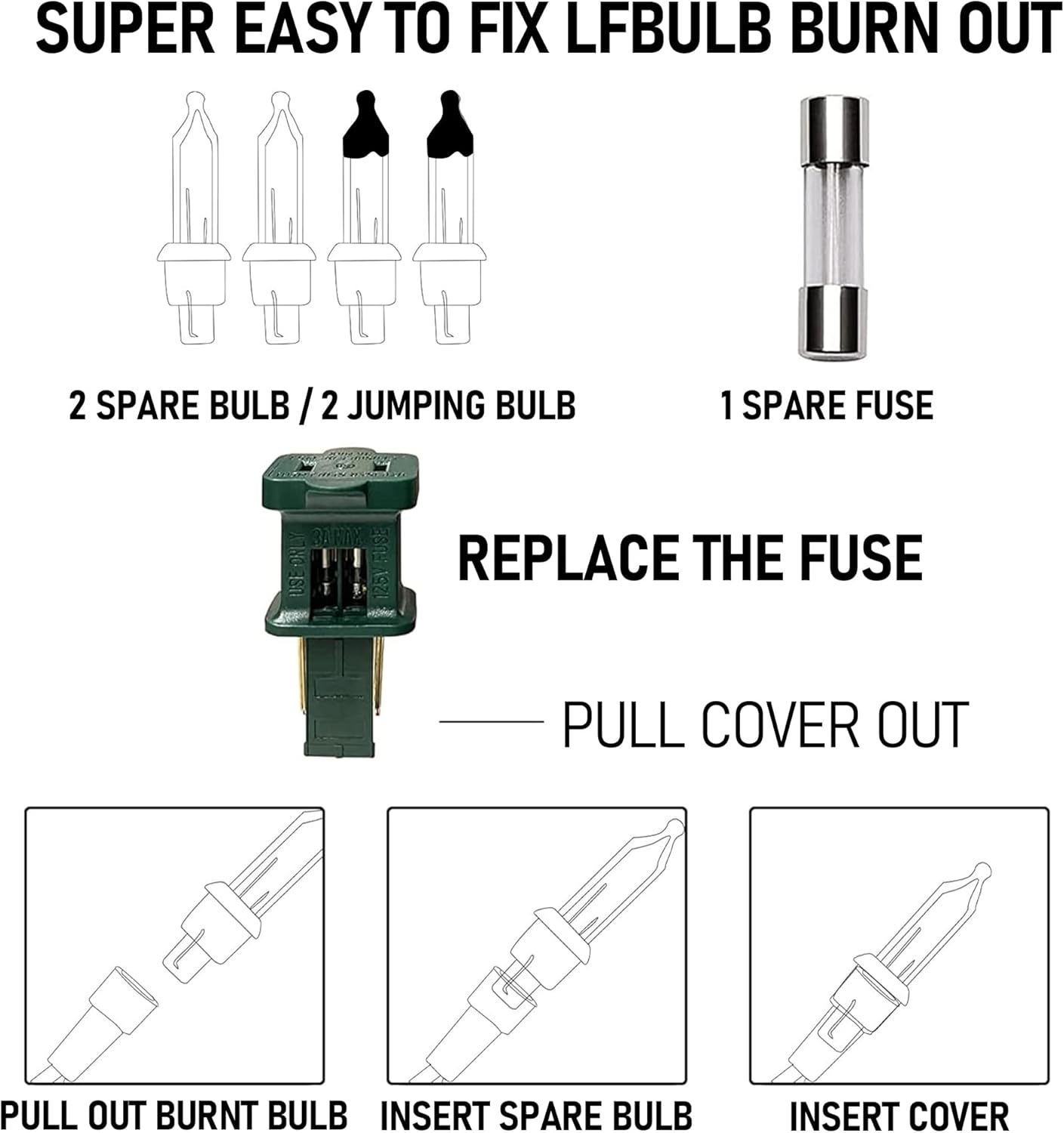 - Christmas Lights: Includes 2 x 20 ft light strings, 2 x spare fuses, and 8 x additional incandescent bulbs for a total of 1000 lights
