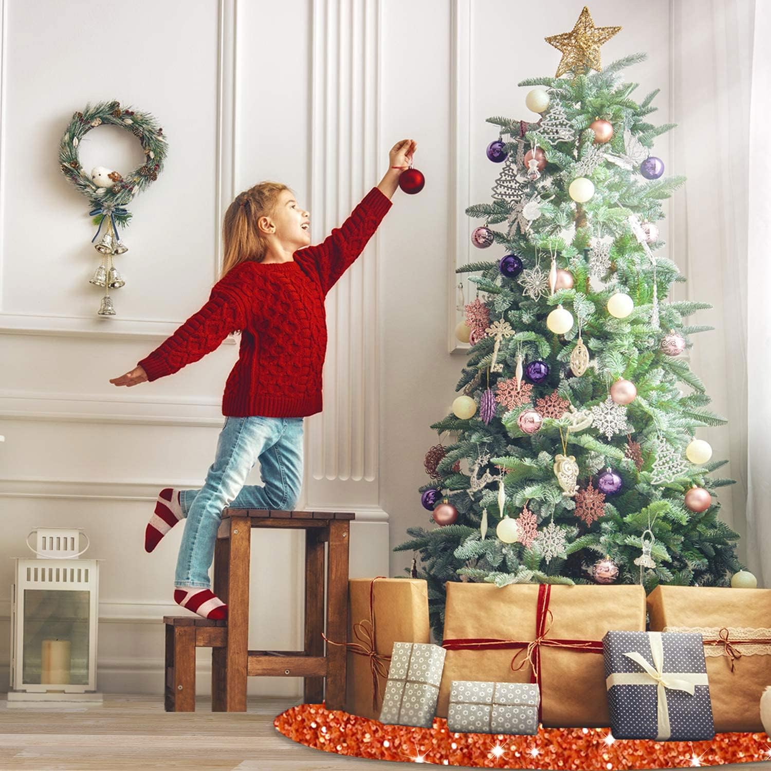 - âď¸ăSize Detail - Orange Tree SkirtăYou will receive a 36 inches diameter burnt orange glitter sequins tree skirt, fits under 6 foot tall trees. You can put some gifts, Christmas boxes, Christmas ball on the xmas tree cover mat. The sparkle velour Christmas tree skirts is perfect for decorating your home and become part of your holiday tradition.