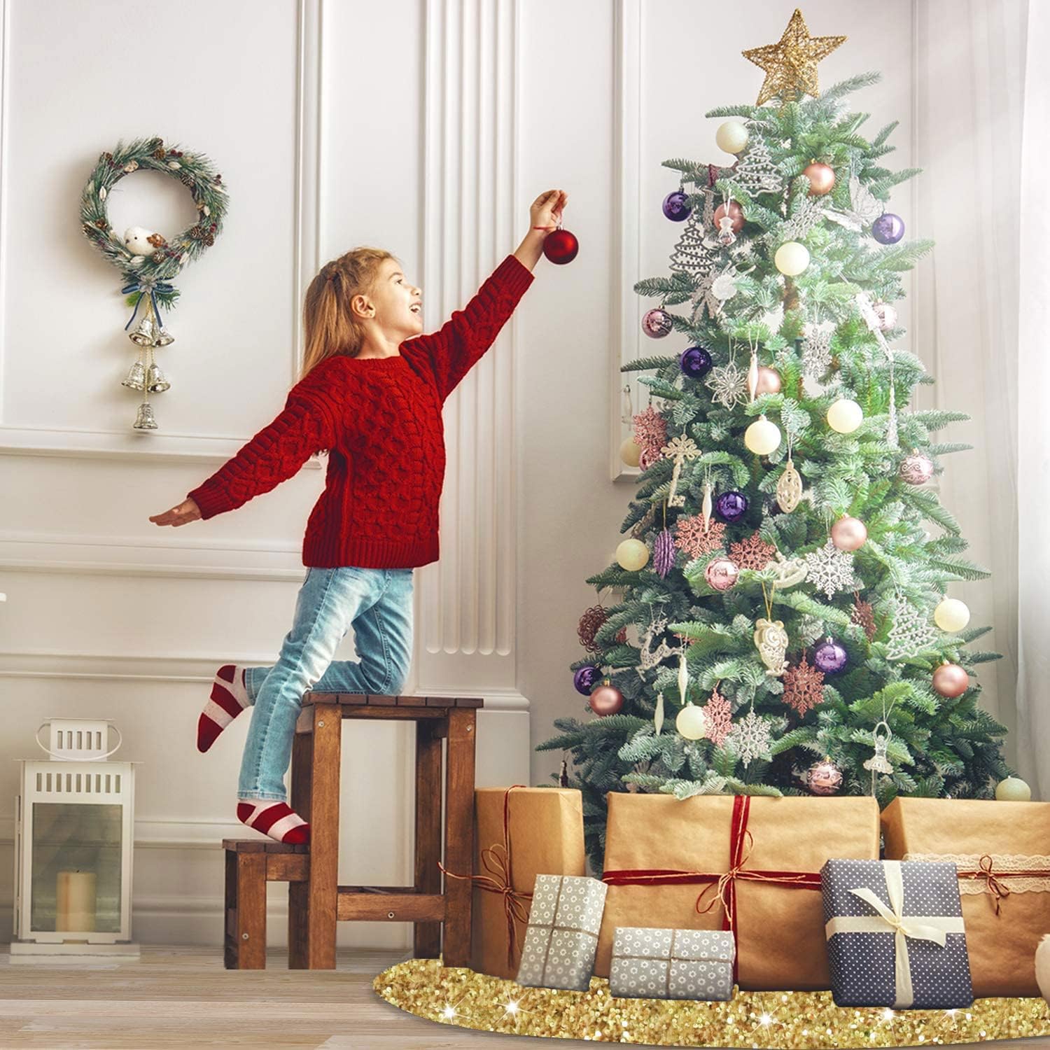 - âïžăSturdy Material - Gold Christmas Tree SkirtăOur Christmas sequin tree skirts are made of premium 5mm sequin fabric and thick velvet material, which can show bright color at any angle. Different from the traditional sequin Santa trees skirt, this Santa tree mat won't fall off sequins, more elegant and shiny, adding festive fun to your home.