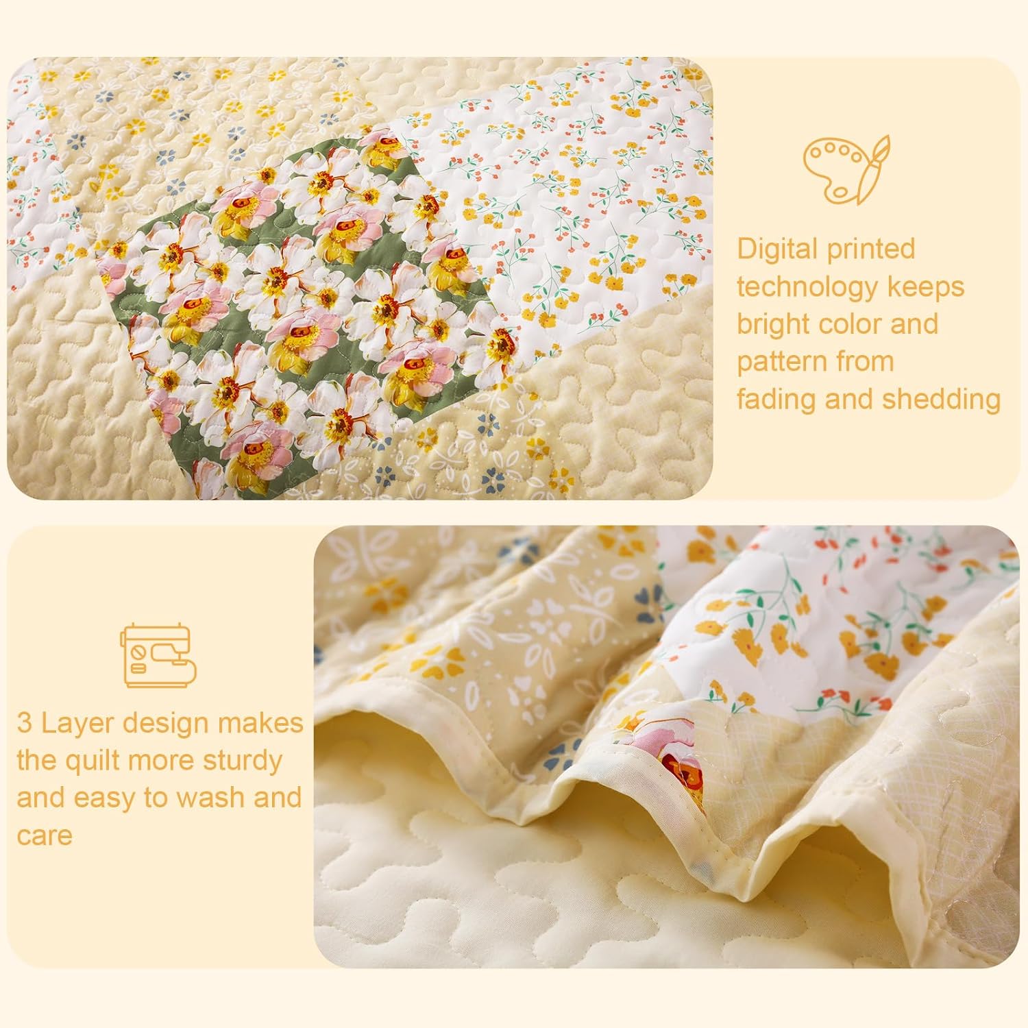 - Design: Pastel yellow floral patterns are carefully printed on this quilt bedding set. Thanks to the high-tech digital print technology, this bed cover could keep its vibrant colors and patterns from fading after washing