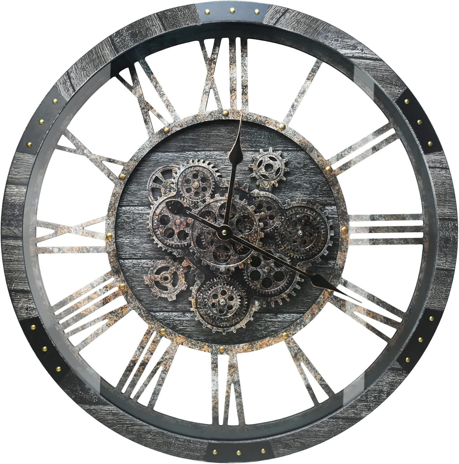 DORBOKER 36" Extra Large Wall Clock with Moving Gears, Oversized Giant Industrial Steampunk Rustic Clocks for Wall Decor Living Room Home Office, Solid Wood Retro Metal,Carbon Grey