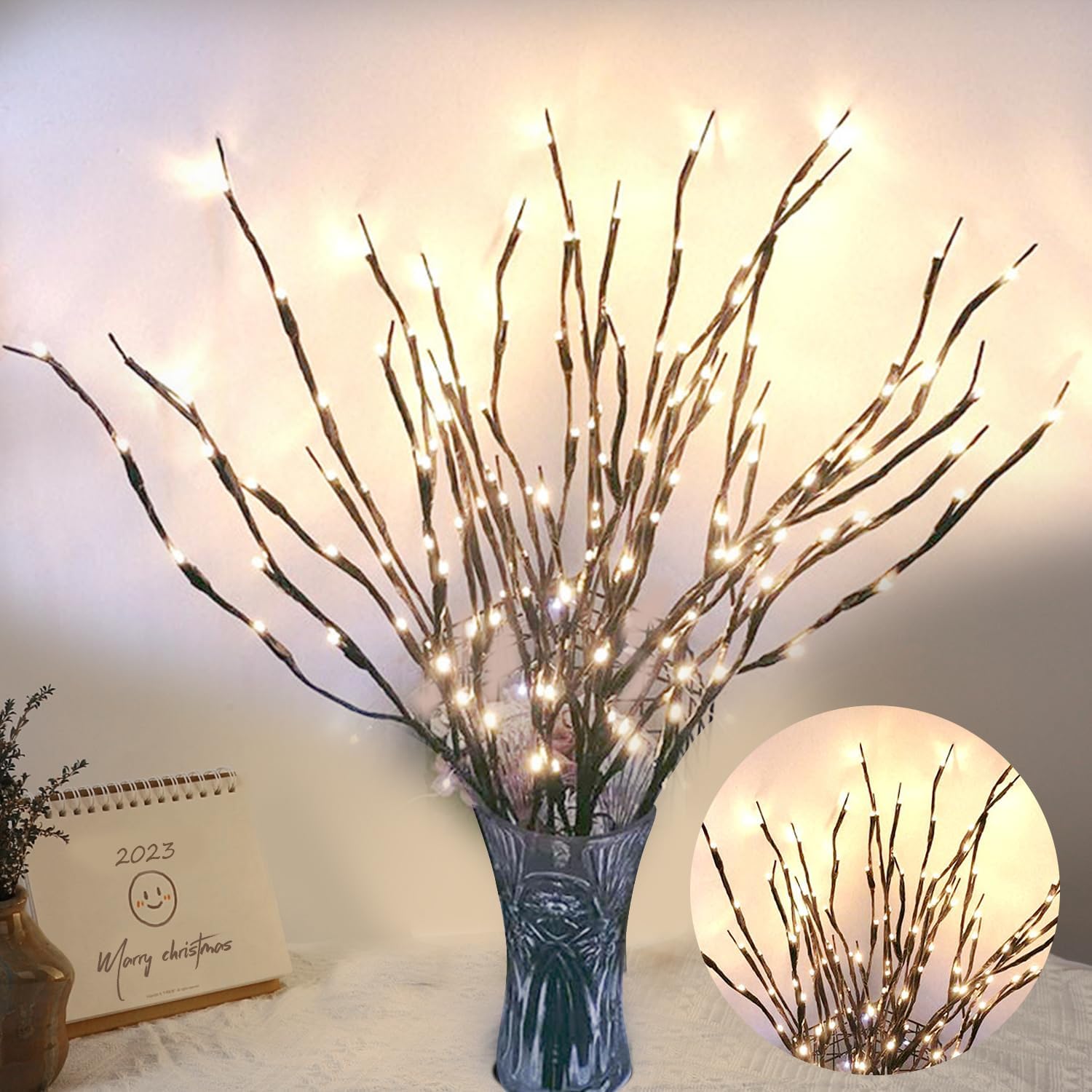- 【 Specification】 -- Each decorative willow twig lights comes with 5 bendable stems, 30 inches total length, and 20 led white light bulbs. 2 packs of branch lights together to make the foliage look more lush.