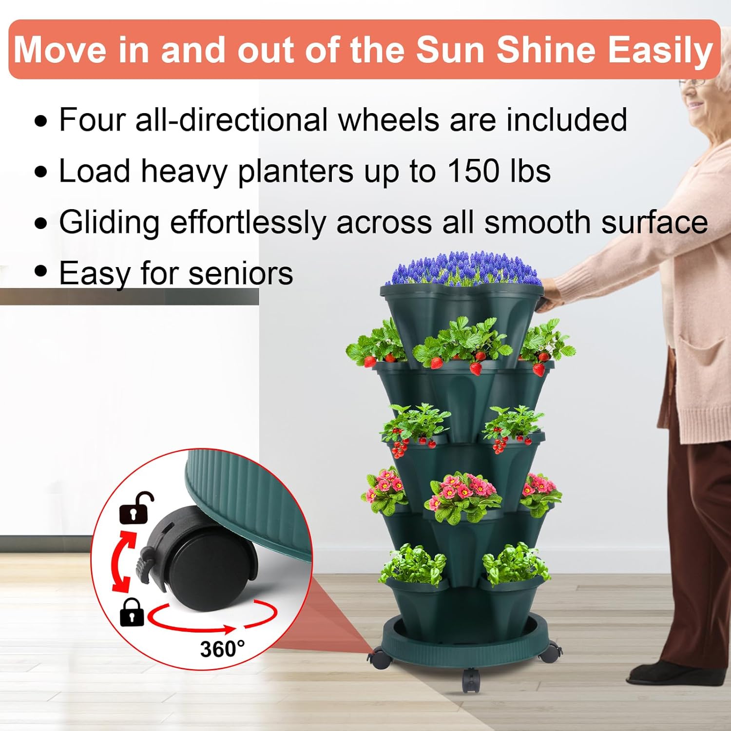 DUNCHATY Stackable Vertical Garden Planter with Wheels, 5 Tier Herb Planter Pots for Growing Vegetables and Succulents, Pine Green