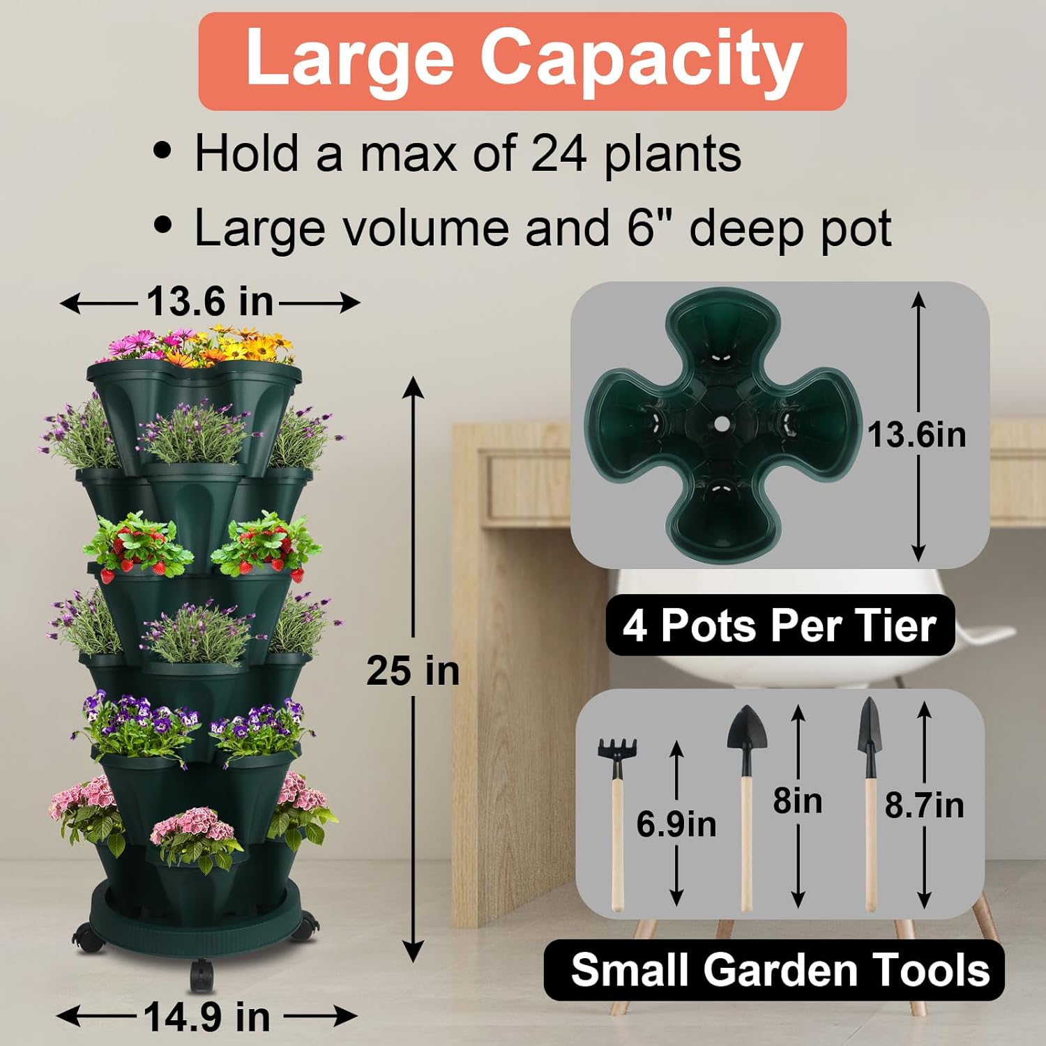 DUNCHATY Stackable Planter, Vertical Garden Planter with Wheels and Tools, Self Watering Strawberry Planter Indoor/Outdoor 6 Tier Herb Planter Pots for Growing Vegetables and Succulents,Pine Green