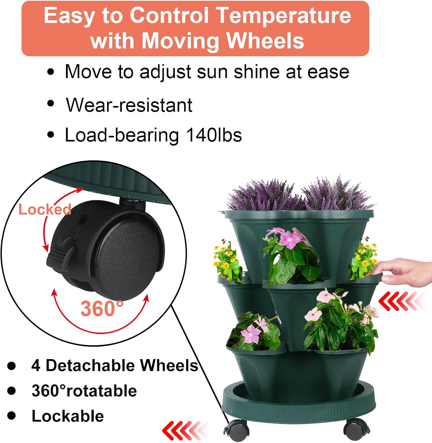 DUNCHATY Stackable Planter, Vertical Garden Planter with Wheels and Tools, Self Watering Strawberry Planter Indoor/Outdoor 3 Tier Herb Planter Pots for Growing Vegetables and Succulents,Pine Green