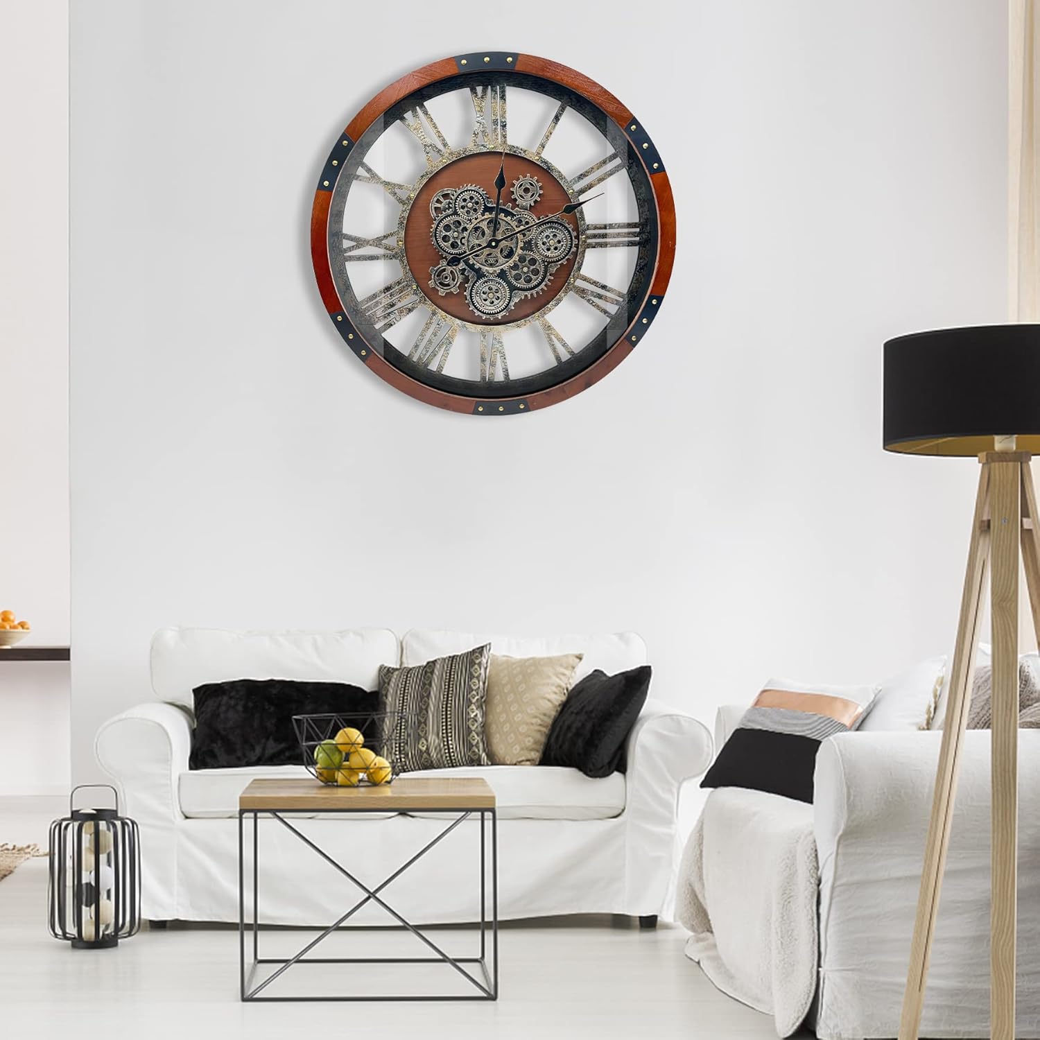 - 🧭【Unique Design, Only For Your Home】 Round solid Wood frame and classic retro skeleton with real mechanical moving gears in the central, the wooden frame is handcraft, showing unique attractive wood grain color and small natural knots; artificial rust-imitated treatment marks on the skeleton for vintage and industrial effect; stronger tempered glass resists any breakage and keeps safety whenever; The design is very different from other clocks, just to break the ordinary, only for your home.
