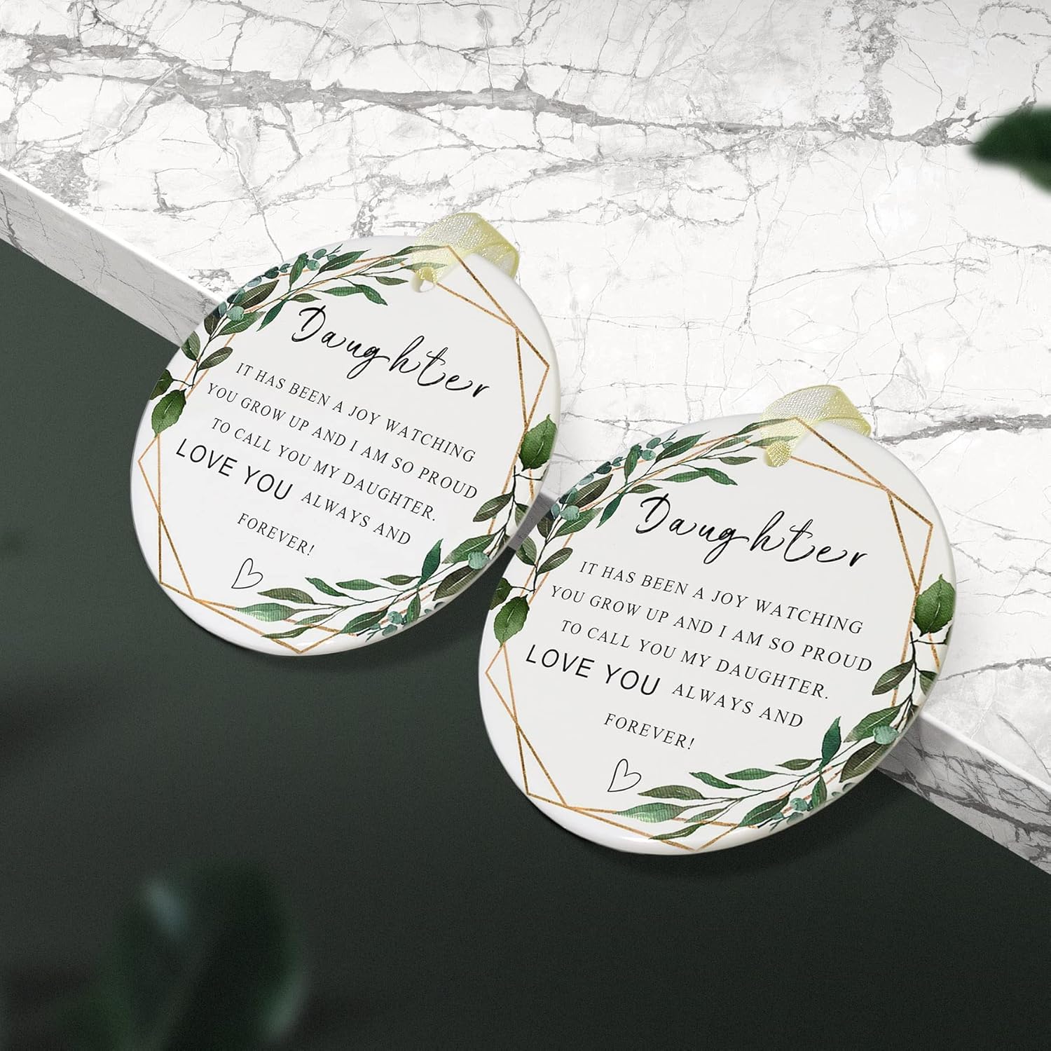 - 🌼【Perfect and delicate size】This is a daughter memory ornament with a diameter of 2.9 inches and a thickness of only 0.18 inches. The product includes: a round daughter ornamentt*1, a gift box*1 and a lanyard*1. The gift box comes with it makes it easy for you to give the best daughter ever gifts directly to family and friends and other special people in your life, and the lanyard that comes with it helps to hang it easily on the Christmas tree or anywhere you want.