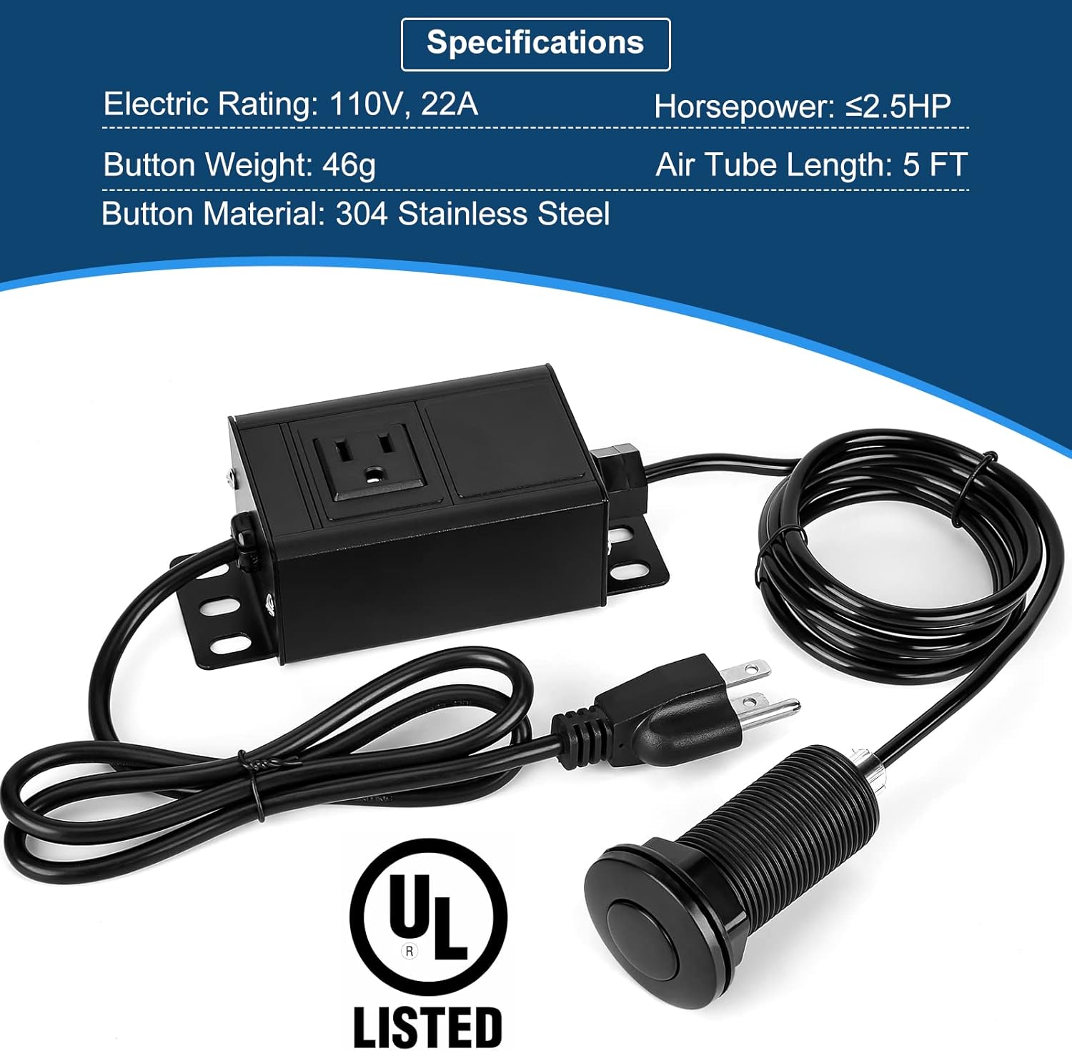 - Safe and Reliable: With PAHTTO air switch kit, you can easily and safely switch on your garbage disposal even with wet hands. The power-supply cord is 18AWG and UL certified for long service time and high safety, suitable for 110V.