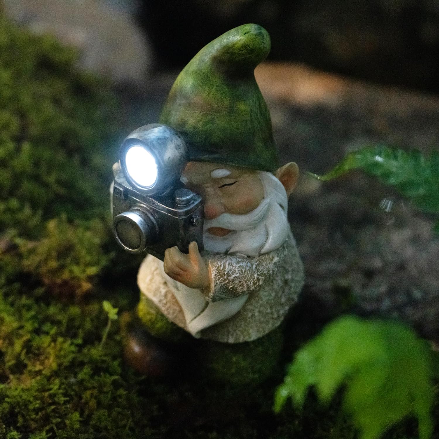 - 【 SOLAR POWERED OUTDOOR GNOMES 】This solar gnome statue has a unique photo pose design,that emits a warm and bright glow after the sunset. Place gnomes garden decor under full sun to absorb sunlight during the day with the quality built-in solar panel. Just toggle the bottom switchand leave it in the ‘on’ position in the daytime. The solar panel will charge within 5-8 hours during the day and light up automatically at night for 8-10 hours