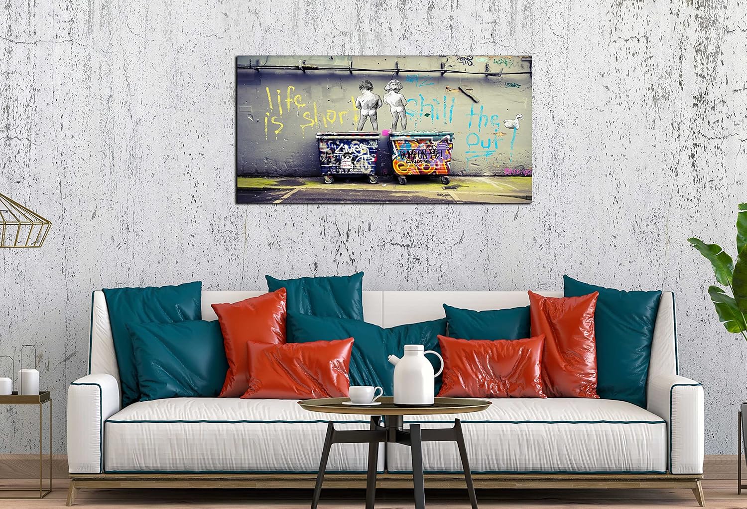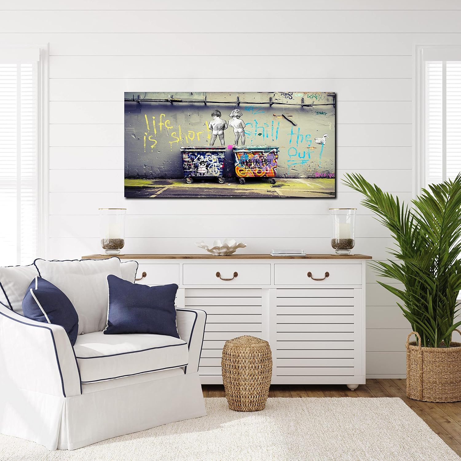 - 【EASY TO HANG】 Each panel of canvas prints already stretched on solid wooden frames, gallery wrapped, lightweight,ready to hang. The side margins are also printed to create a particularly decorative effect.Banksy street art graffiti canvas wall decor.Added color and fun to your bedroom, living room,office, dormitory or apartment.