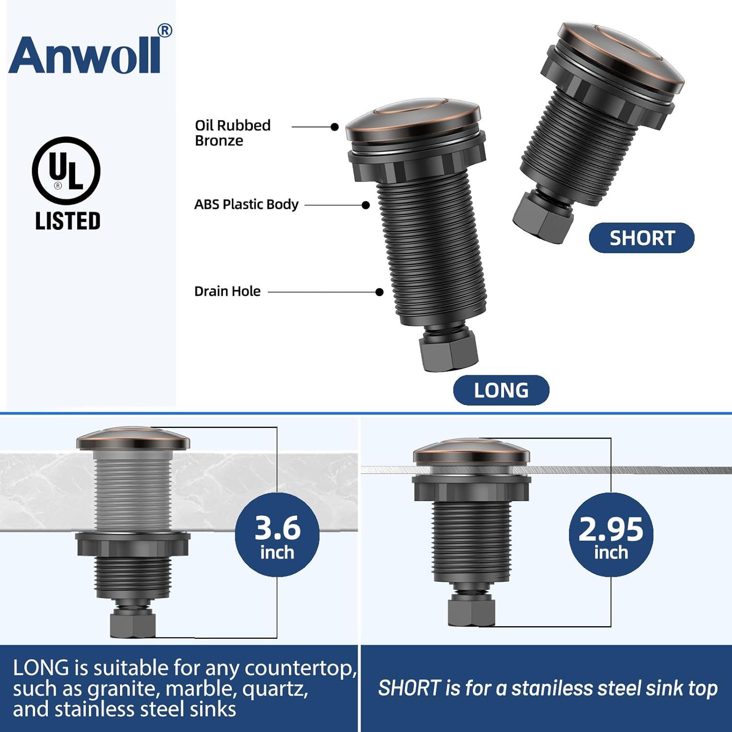 - How to choose the button: To better match, in most cases, the LONG/3.6" is suitable for any thickness of countertops, such as granite, marble, quartz, and stainless steel sink countertops. The SHORT/2.9" is suitable for stainless steel sink countertops.