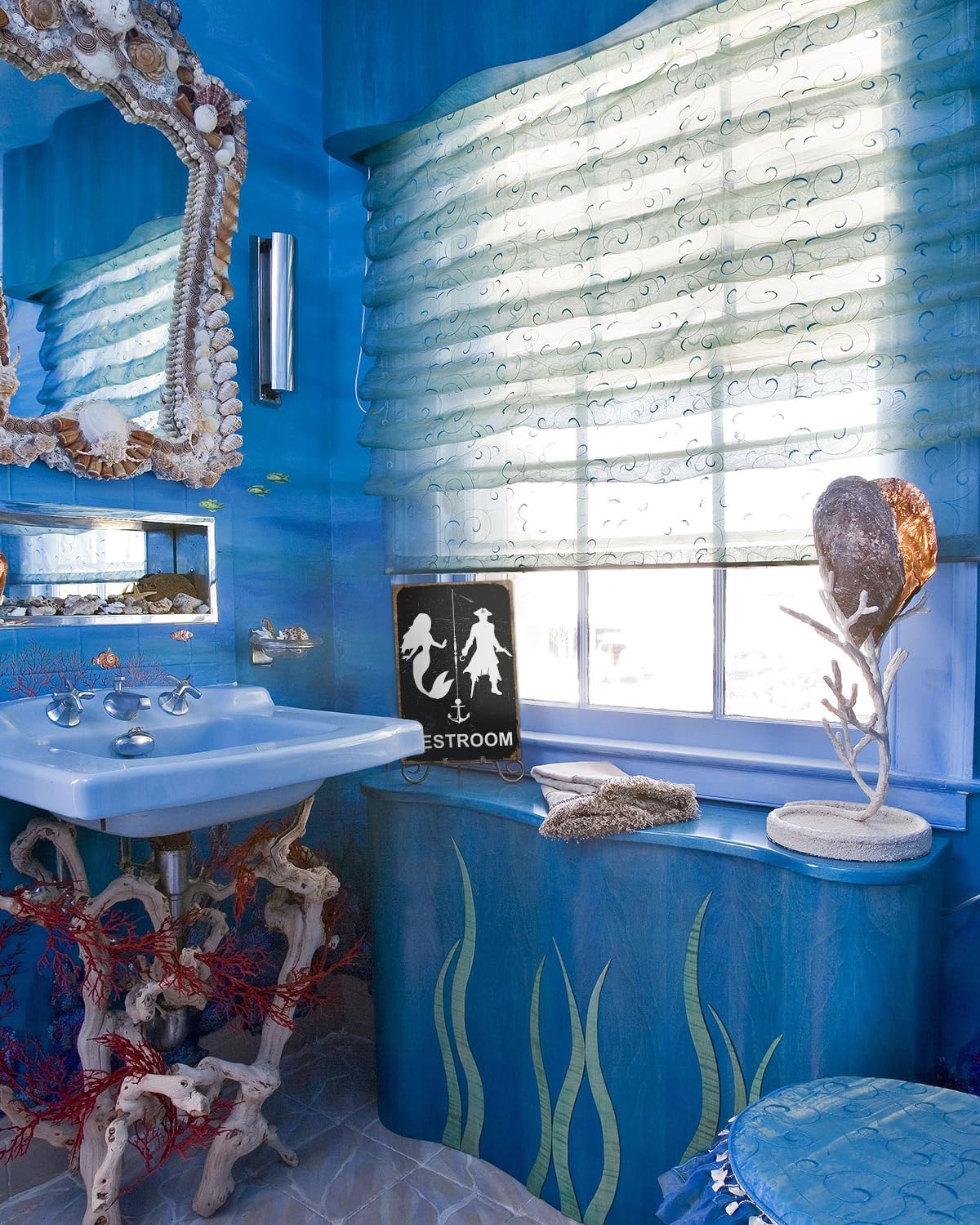 ALKB Nautical Themed Vintage Restroom Door Sign Fun Mermaid and Pirate Sign Suitable for Ocean, Beach, Ship Themed Wall Decor 8x12 Inch