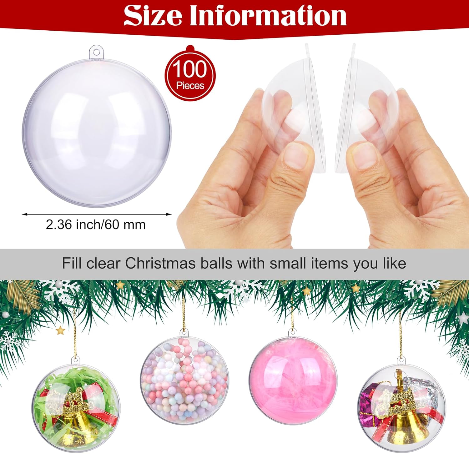 - Versatile application: these Christmas clear plastic fillable ball ornaments have a wide range of uses and can be customized according to the unique characteristics of different festivals, such as Christmas, weddings, New Year's celebrations, and other festive events; these filling Christmas balls are ideal for decorating Christmas trees, fireplaces, staircase railings, storefront displays, indoor and outdoor holiday decorations, gift packaging, candy packaging, and more