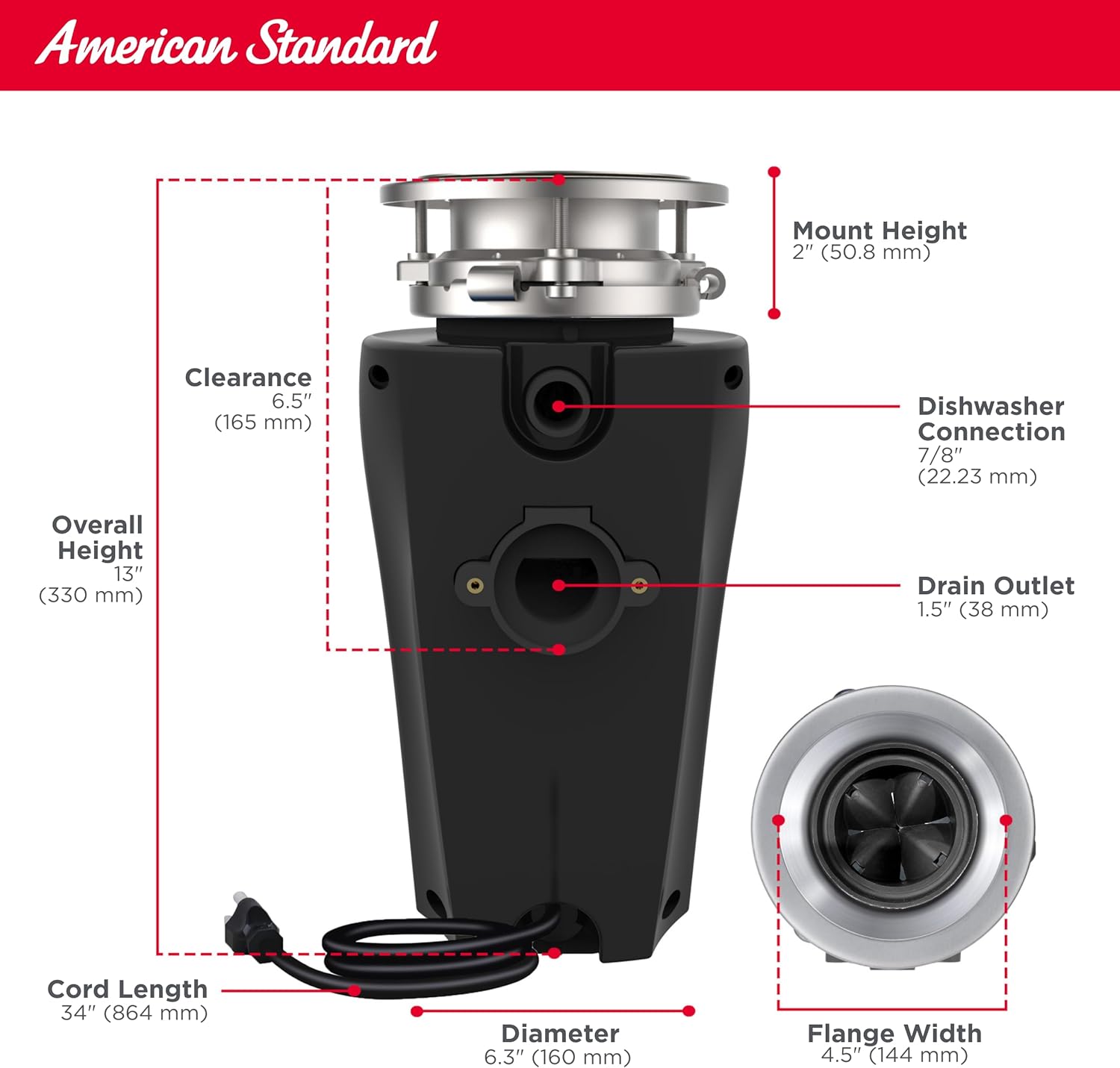 - VERSATILE GRINDING: American Standard garbage disposals handle a wide range of food waste, including soft & tough items, grinding them into fine particles that easily pass through your plumbing system and is safe for septic tanks. This makes it suitable for various kitchen needs