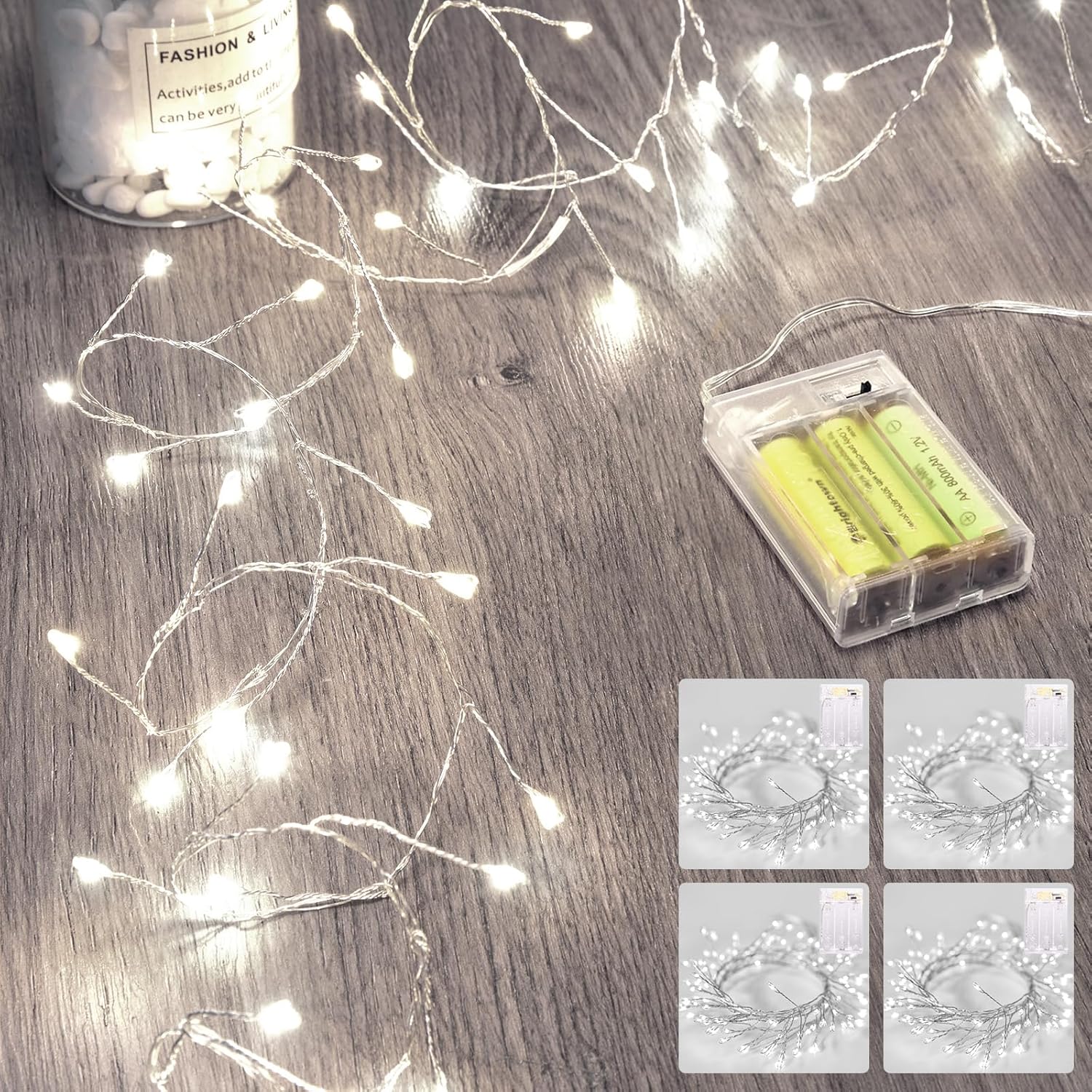 4 Pack Fairy Lights Battery Operated, Twinkle String Lights Waterproof Silver Wire 5 Feet 60 Led Firecracker Starry Lights for DIY Wreath Wedding Party Bedroom Mason Jar Holiday Christmas, Pure White