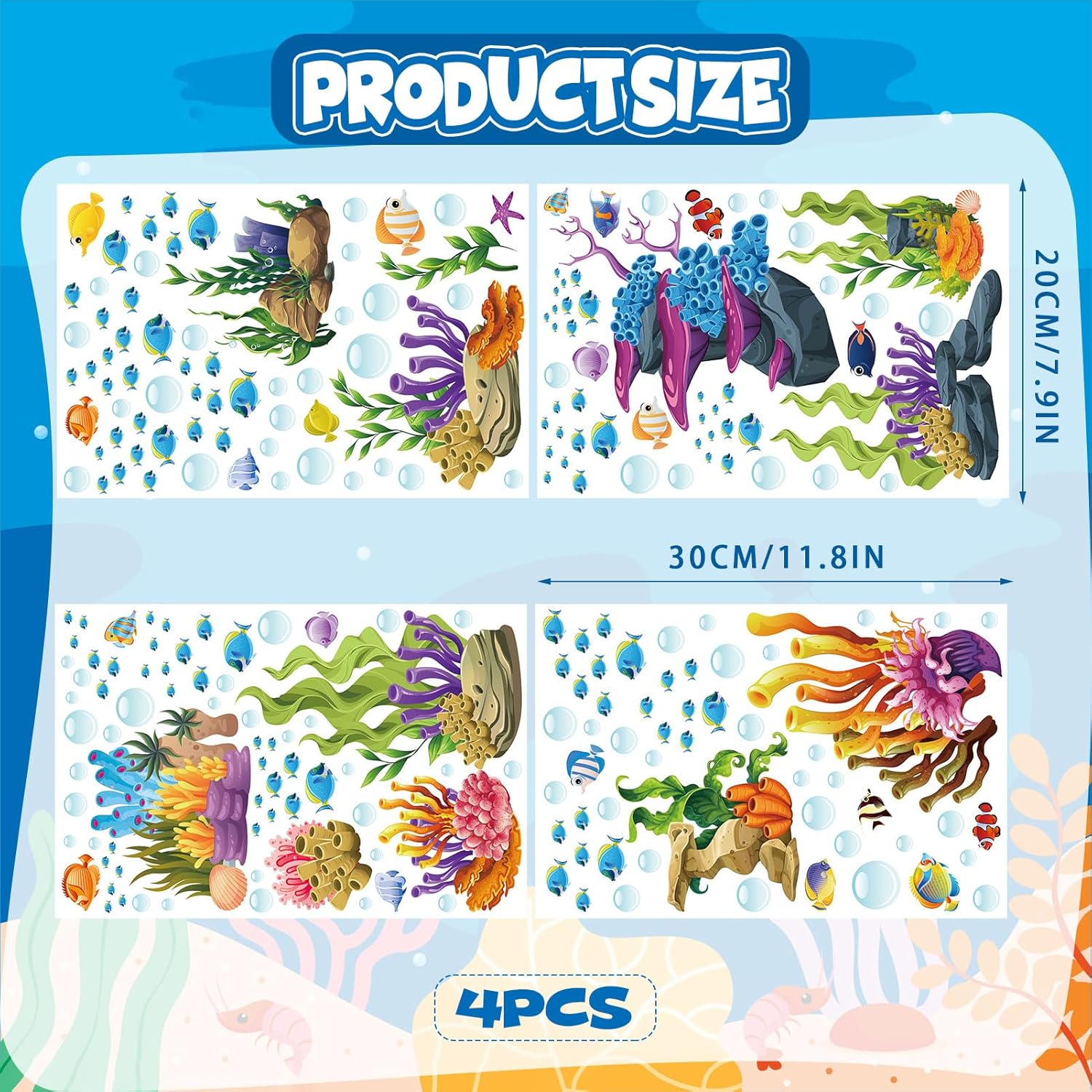 - GLOW UNDER THE SEA WALL DECALS:You will get these 4 sheets of glowing ocean wall stickers, the size of each sheet is 20 x 30 cm. That they glow blue in the dark.Including coral reef, seaweed, sea grass, fish,bubble etc. It's Ideal for decorating children's rooms.