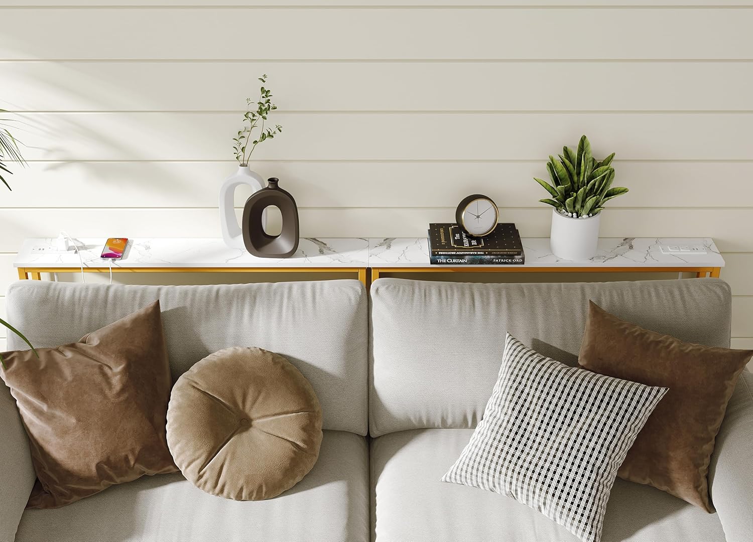 ELYKEN 2 Pack 5.9" Narrow Console Sofa Table with Power Outlets and USB Port, 5.9" Dx39.4 Wx31.1 H Marble Texture Skinny Couch Table with Golden Metal Frame