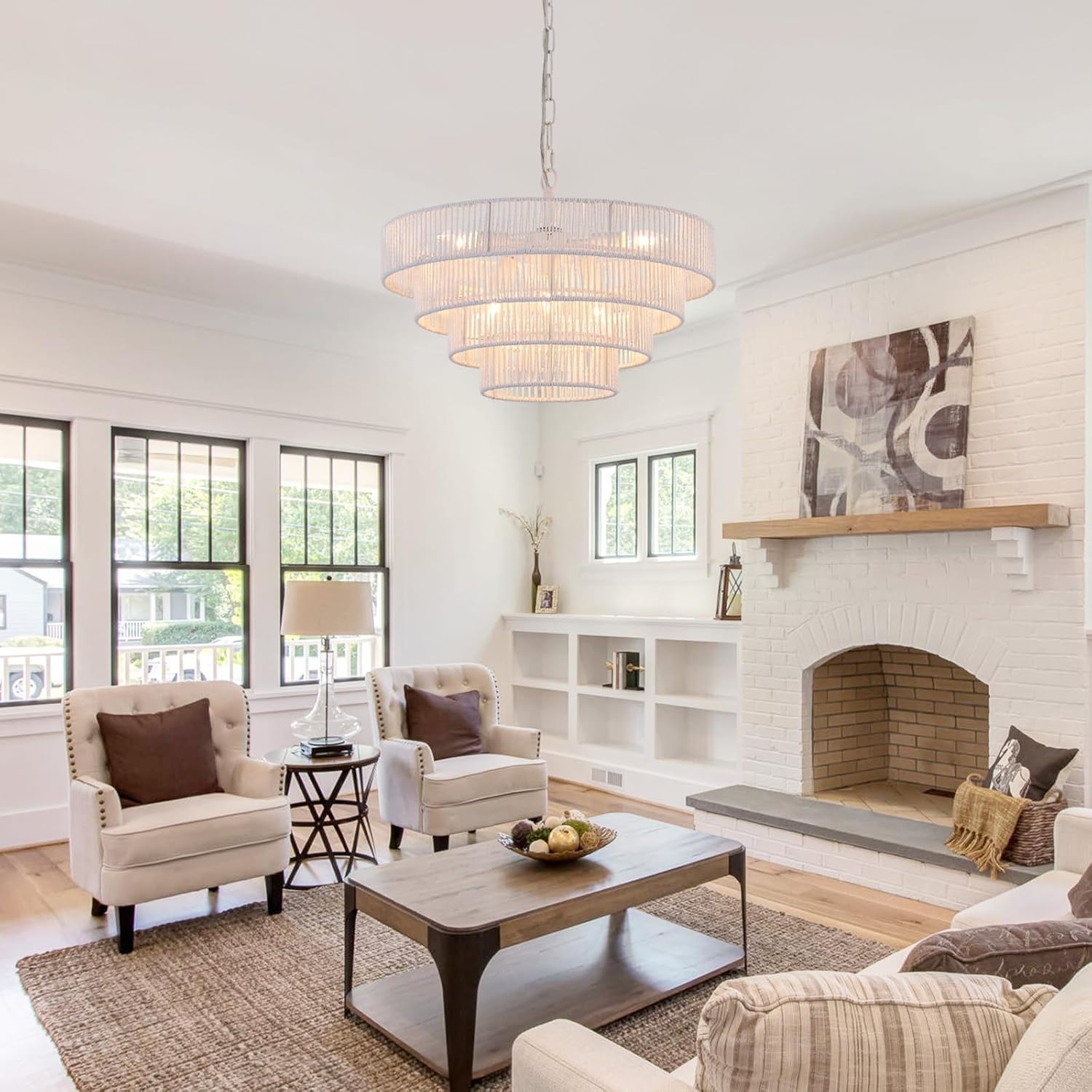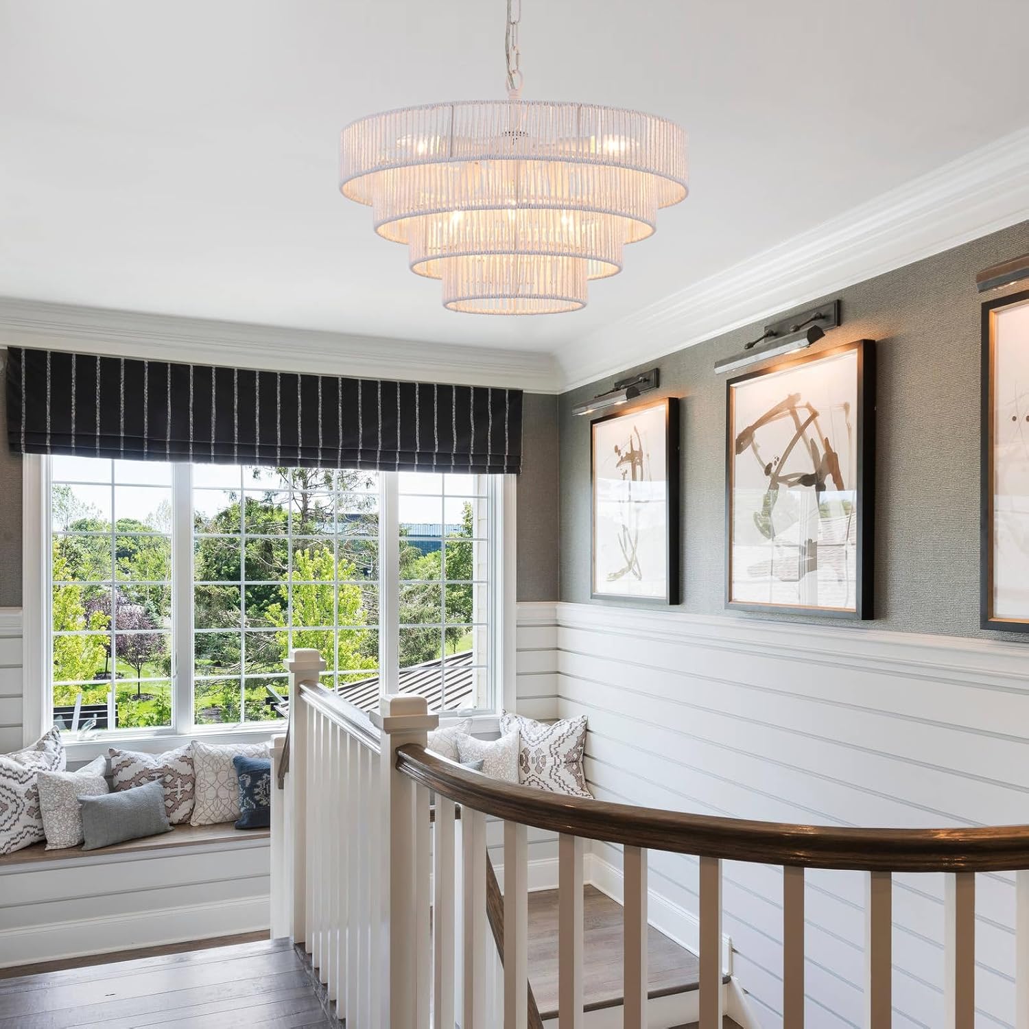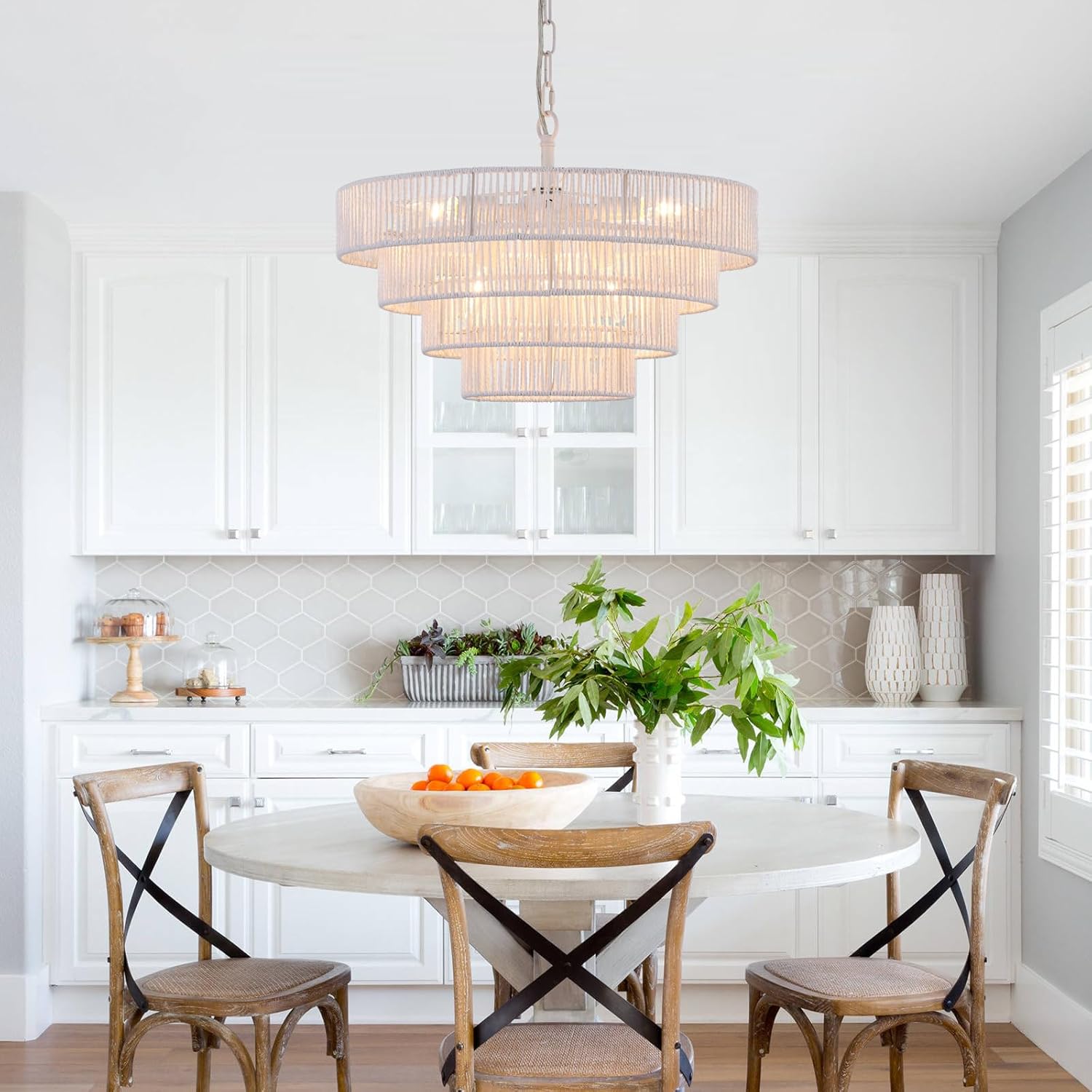 - Eye-Catching Design: This woven rattan chandelier is made of wicker woven with high-quality 4 round metal frames finished by white, forming a semicircular hollow cage, combining boho, modern, and elegant feelings to your home.