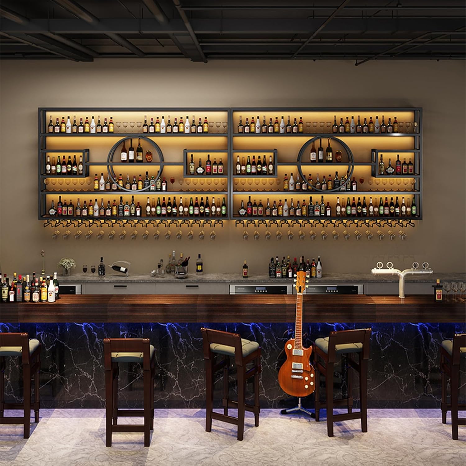 - 【Large Storage Space】The wall-mounted wine rack can be used as a bar decoration or a large wine storage cabinet. This height can store most wines or spirits when we sit at a small bar to relax all day or have a party. The wine glass rack is sturdy enough to hold more wine glasses. The wine rack doubles as a large storage rack, making the space look neat and organized