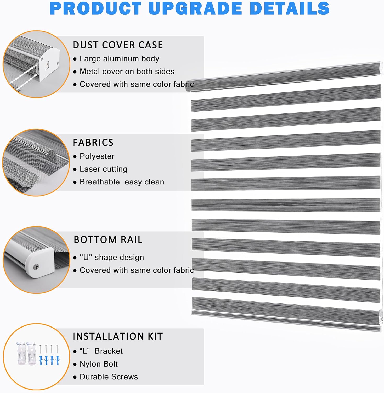 - Custom Size Zebra Blinds for Windows with a premium polyester fabric - High-End Quality - Easy to install - Easy to clean - Blocks light.Grey Color