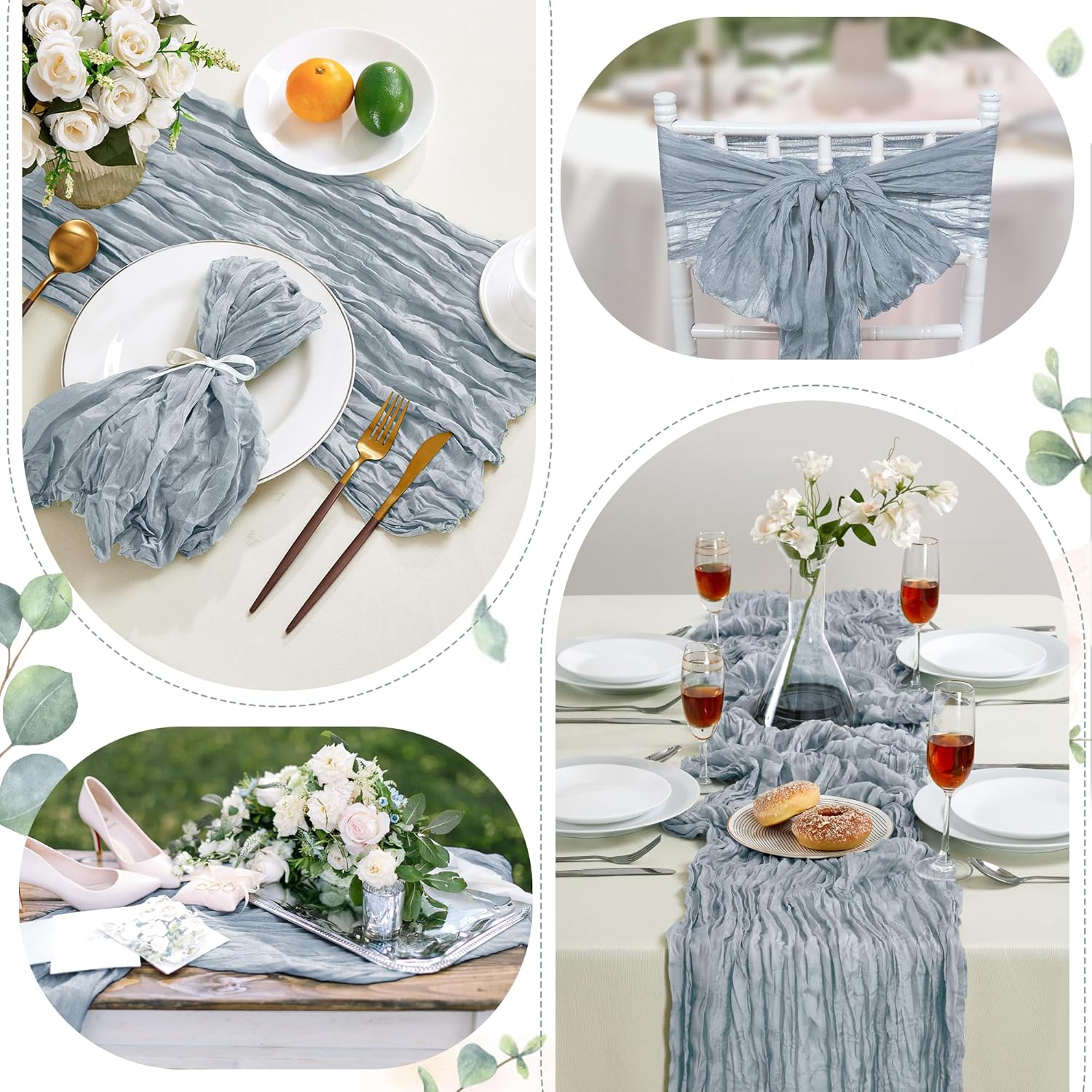 - PACKAGE INCLUDED: You will receive 24 pieces of dusty blue cheesecloth table runners. Elegant and beautiful design, exquisite workmanship. Product size: Each boho table runner is 35 x 120 inches. Enough to cover rectangles and round tables, as well as long tables that are stitched together. It can even be used to belt chairs decorate napkins, background curtains. Round or square tables for 8-10 people, perfect for romantic and elegant party events