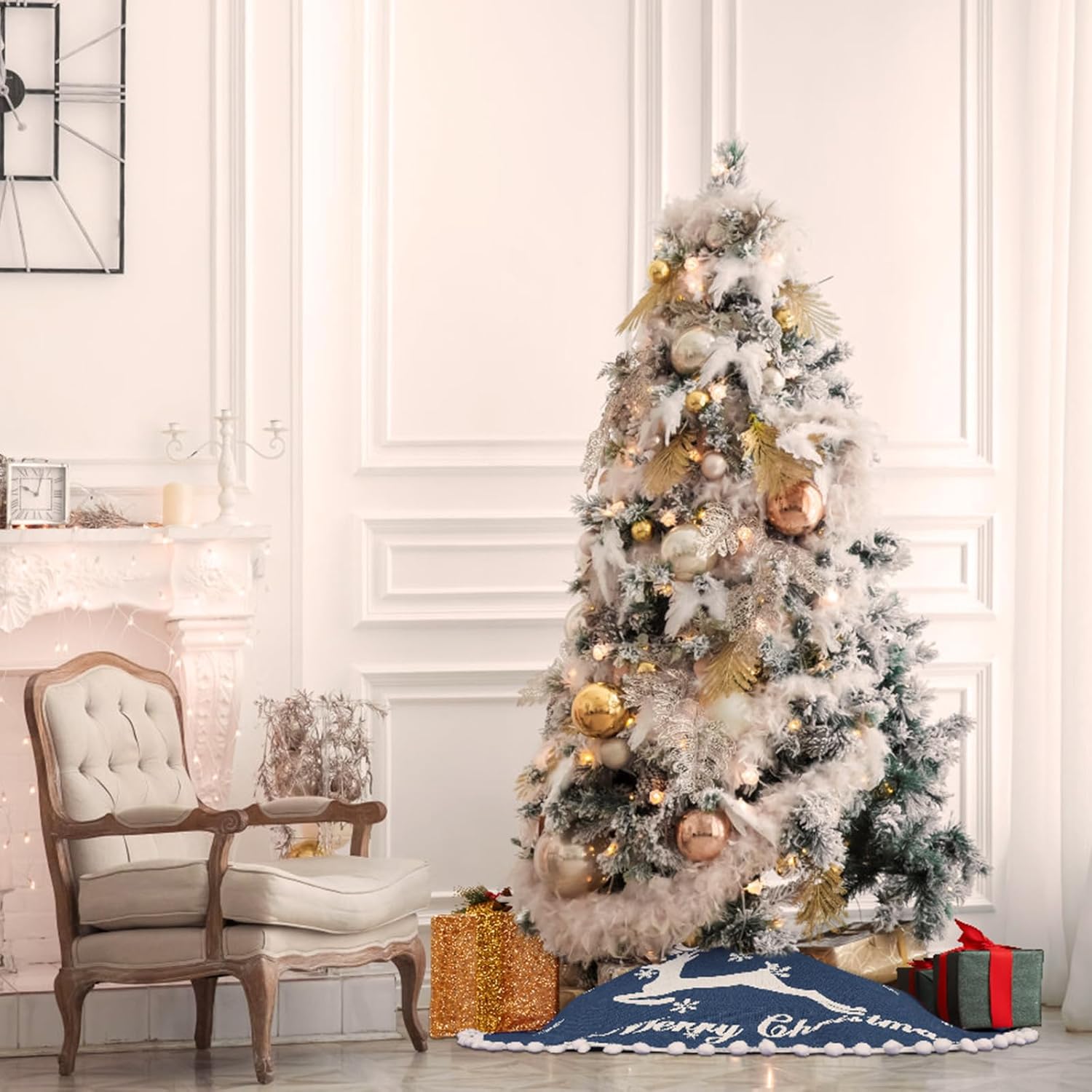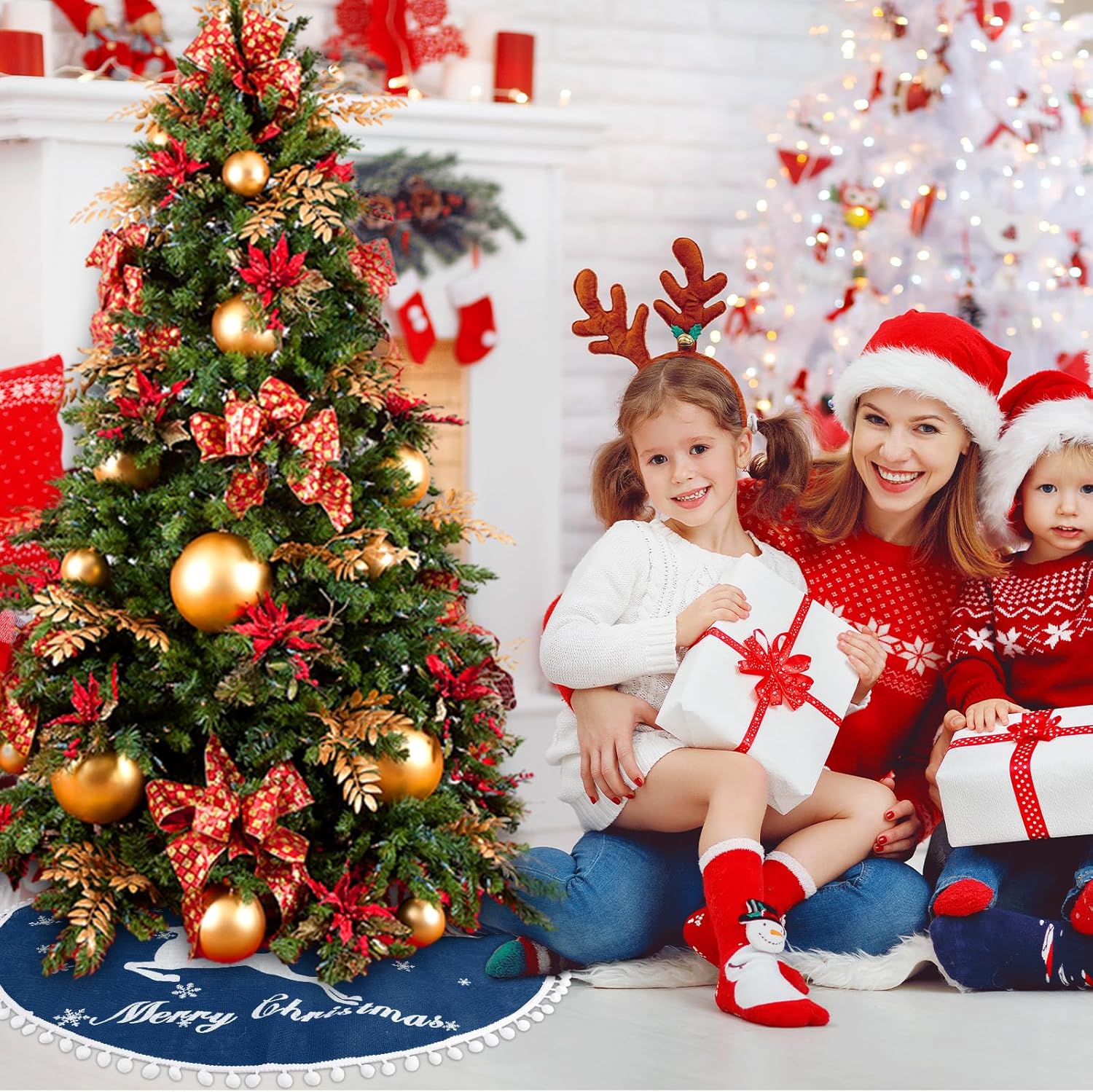 - Merry Christmas Tree Skirts:Our xmas tree skirt is printed with elk and various sizes of snow patterns, as well as the words "Merry Christmas." The edges are adorned with small, fluffy balls, adding a festive touch to your Christmas tree. This 30-inch tree skirt is perfectly sized for most Christmas trees perfectly. Before making a purchase, please measure the diameter of your tree to ensure a perfect fit