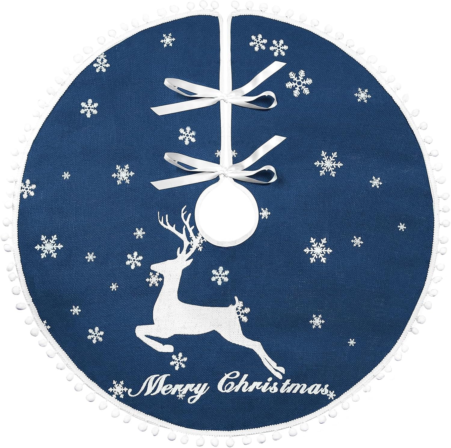 - Burlap Material Tree Skirt:This rustic tree skirt Christmas is made from natural burlap. The color has been safely treated to present a classic Christmas blue. This fabric makes the Christmas tree skirt tough, durable, and environmentally friendly, and it will not pill. The tree skirt can be reused in subsequent years