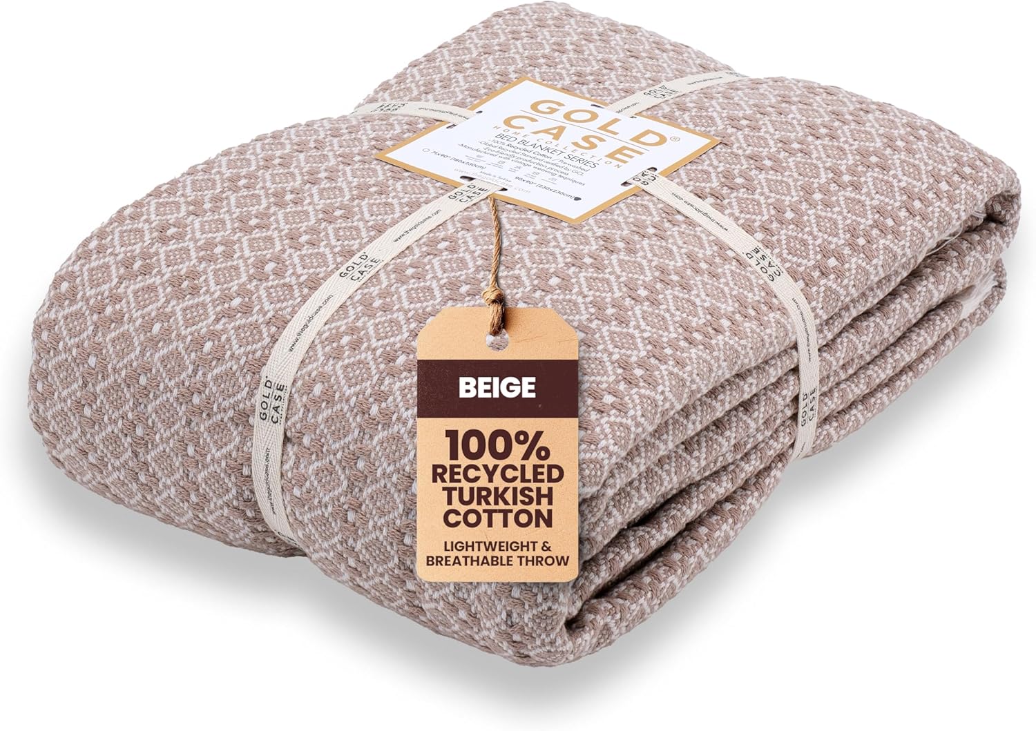 Gold Case Throw Blanket for Bed – 100% Recycled Turkish Cotton Bed Blanket – Decorative Throw Cotton Blankets for Living Room & Bedroom – Retro Beige Woven Queen Blankets – 90x90