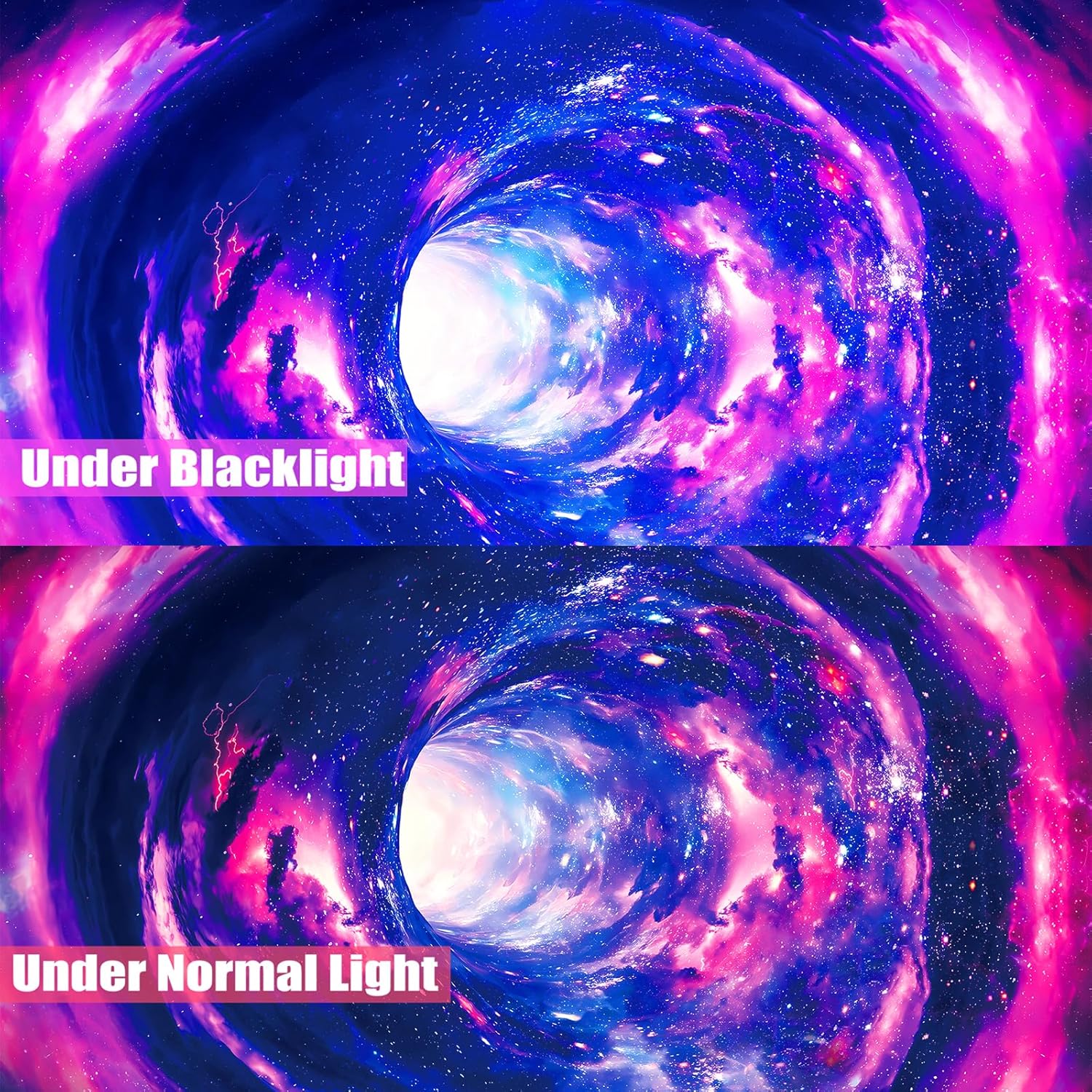 - 【Blacklight 3D Effect】: This blacklight galaxy 3D tapestry can produce realistic 3D effects and has a brighter color under black light or UV lights, which makes people feel as if they are about to be sucked into the hole. It is very amazing