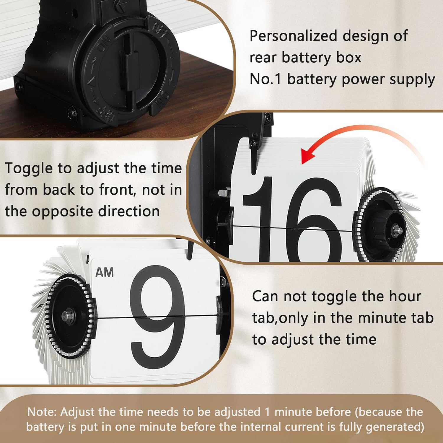 Flip Desk Clock, Retro Vintage Flip Desk Table Clock, Digital Sided Large Numbers Mechanical Flip Clock Wood Base for Living Room, Study Room and Office(Black)