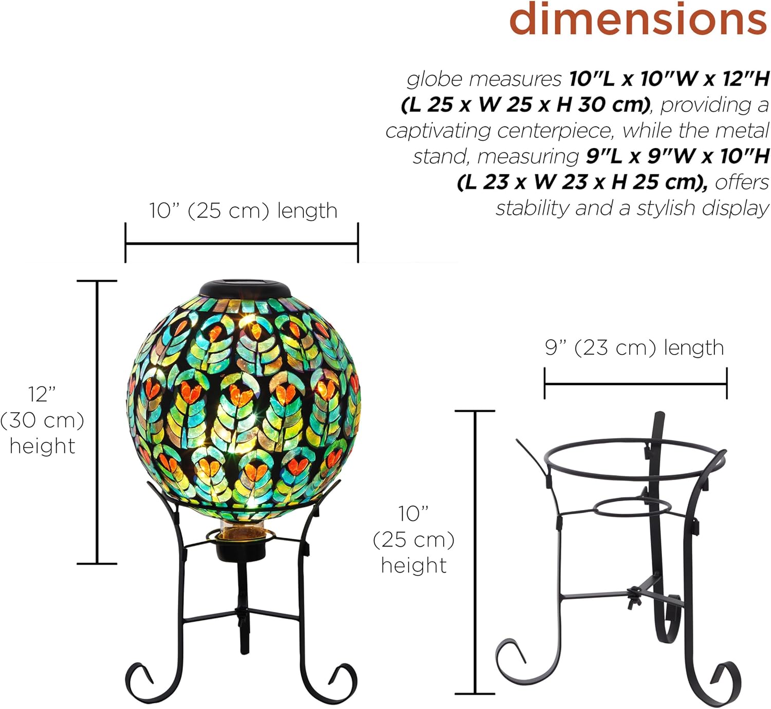 - SOLAR COLORFUL MOSAIC GAZING GLOBE: Add color, whimsy, and delight to your garden or patio during the day and evening illumination with this stunning gazing globe that features an artistic peacock feather design to elevate elegance