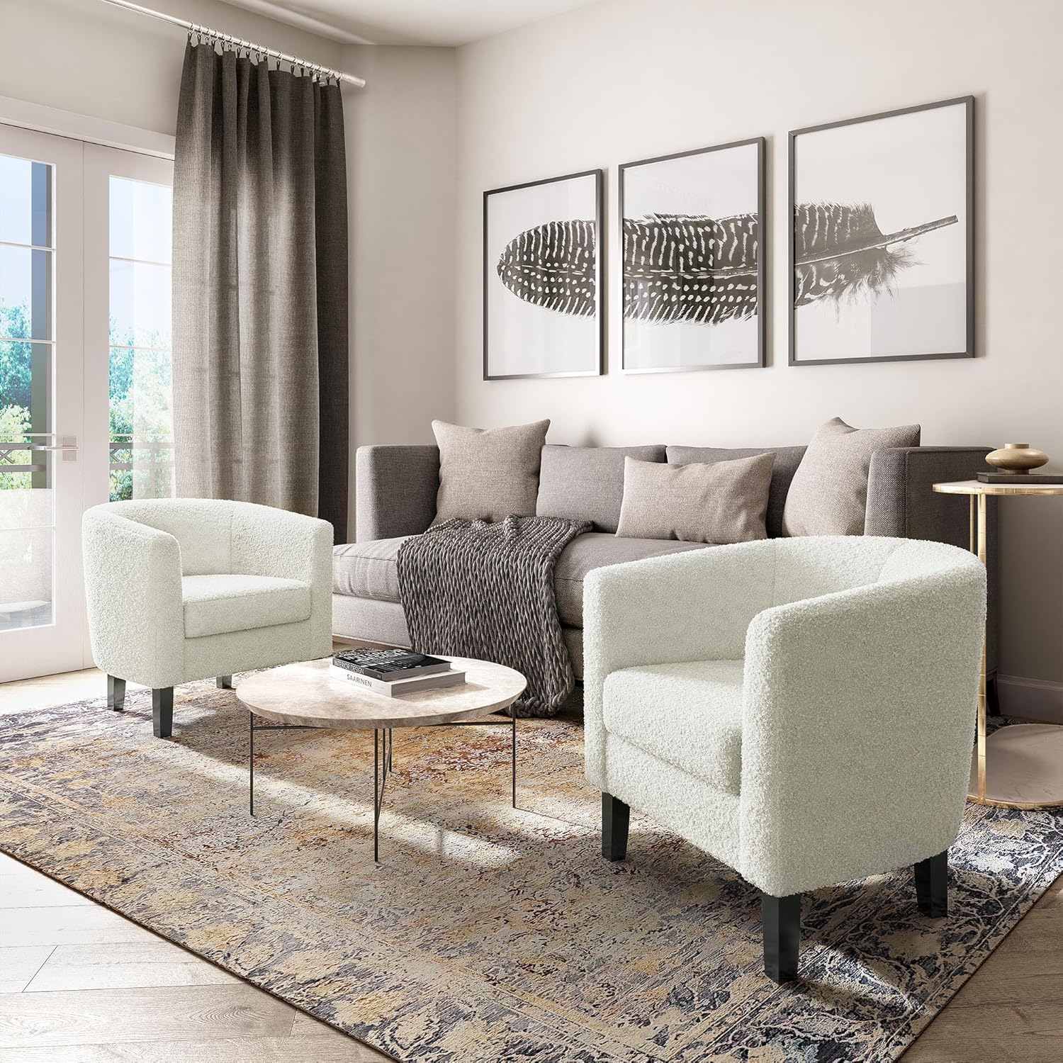 BELLEZE Accent Barrel Chair Set of 2, Linen Round Chair Club Tub Sofa Corner Chair with Flared Legs and Cozy Soft Padding for Living Room Bedroom Waiting Room - Teddy White