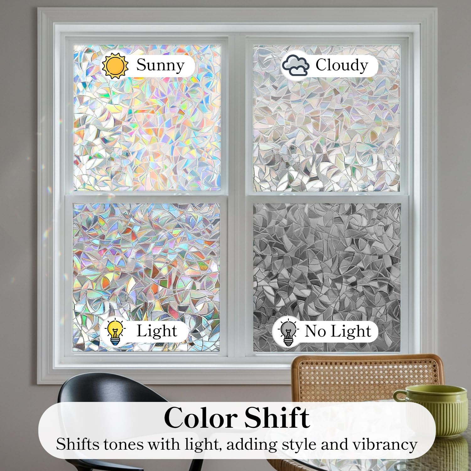 - 【Privacy Protection】Our privacy film for glass windows can provide privacy protection, blur the view outside, and allow soft light to enter, creating a private and comfortable space for you.(Rainbow window film is a semi-private window film and is not recommended for use in bathrooms. If you need to use it in the bathroom, we recommend you choose our high-privacy decorative window film.)