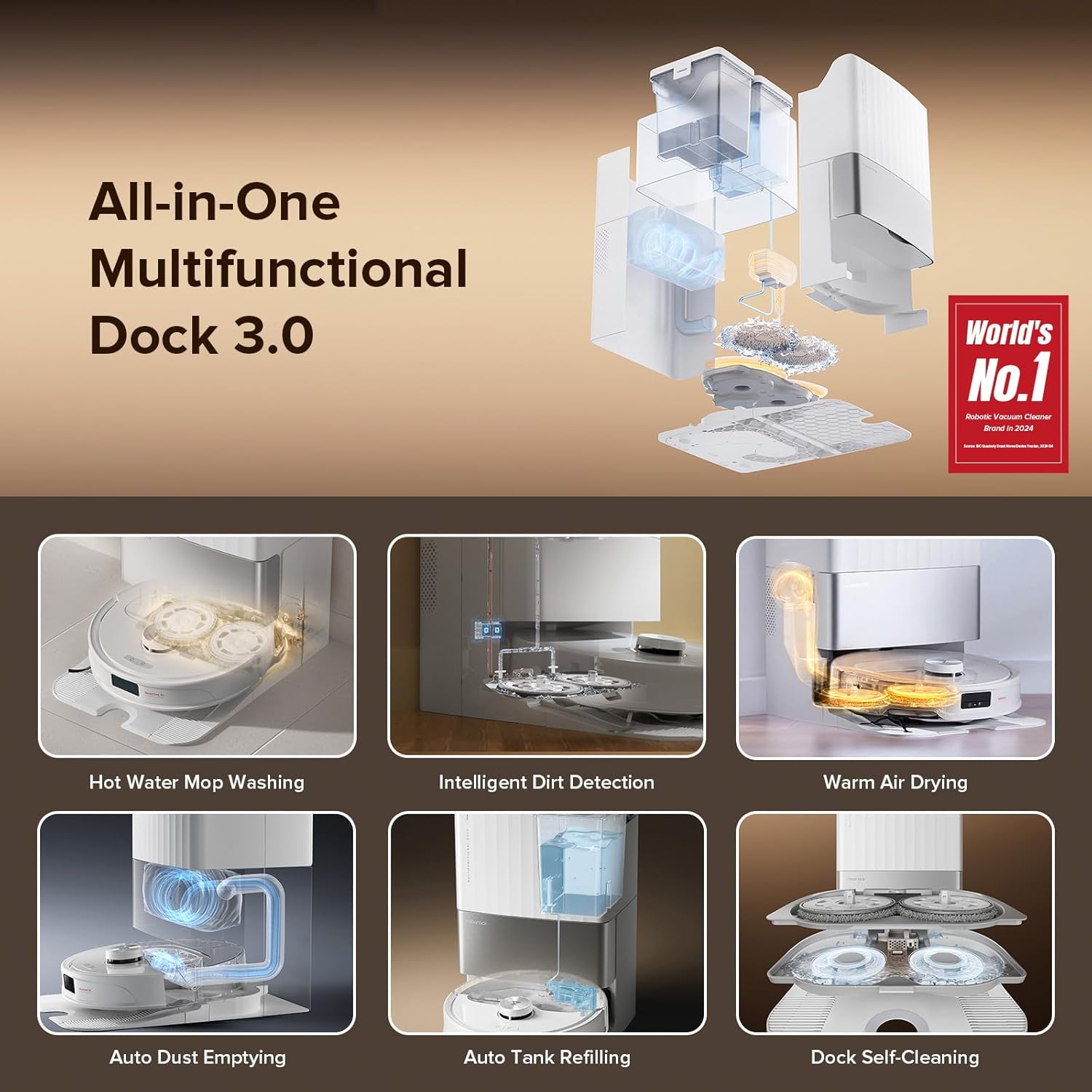 - Multifunctional Dock 3.0 - Upgrade to unmatched convenience with our advanced docking station. Intelligent Dirt Detection uses hot water for a thorough mop rinse and revisits heavily soiled areas for spotless floors. The hot water mop wash and 113°F warm air drying keep the mop fresh and ready. Enjoy 7+ weeks without emptying thanks to automatic dust collection and water replenishment. The dock's self-cleaning feature reduces maintenance, ensuring top performance. This revolutionary dock can offer you a truly hands-free cleaning experience, perfect for pet owners and families with kids.