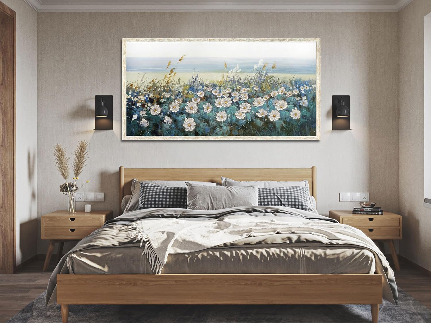 Arjun Flowers Wall Art Canvas White Daisy Floral Painting Blue Coastal Landscape Picture Modern Artwork for Living Room Bedroom Bathroom Dinning Room Office Home Wall Decor Large Framed 48"x24"